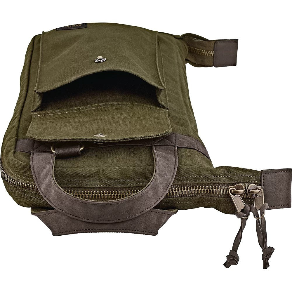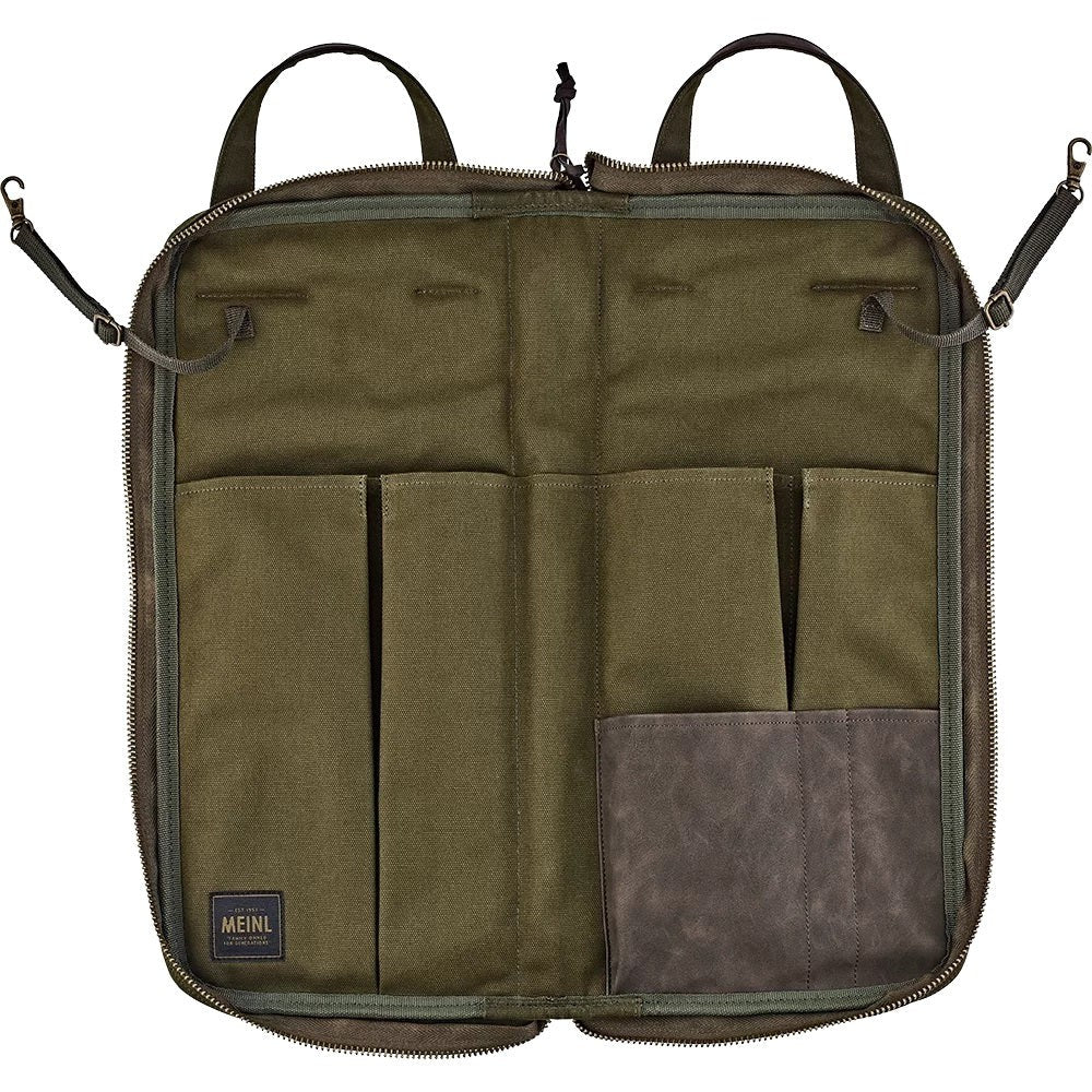 The Meinl Waxed Canvas Collection Drumstick Bag has all the tough usability of a touring bag with classic good looks. Our ultra-durable, heavyweight 24-ounce cotton canvas fabric exterior is finished with an anti-abrasion, water resistant wax coating to maintain a lifetime of use while aging beautifully. Inside the main compartment are five pockets to organize a large number of drumsticks, brushes, rods and mallets. Plus, there are three different sized accessory pockets to accommodate smaller parts or sound effects. This drumstick bag comes equipped with length adjustable floor tom hooks and straps to suspend it in an open position. For quick access storage, the large exterior pocket is sized for common accessories or tools, and it snaps shut to secure your items. An adjustable/removable shoulder strap and reinforced leatherette handle let you comfortably transport this bag to the gig or studio. Getting into the bag is easy with the large zipper pull tabs that come with long leatherette draws. The Meinl Waxed Canvas Collection Bags are designed for an understated and timeless style while being as practical as ever for any type of traveling drummer.