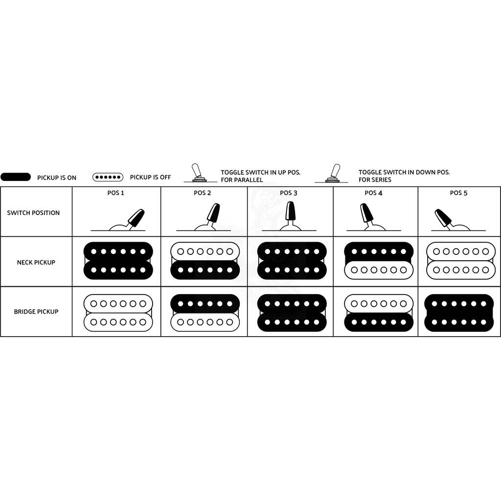 Commutation du micro: lame à 5 positions et mini-touche à 2 voies: (Pos 1: micro à pont, Pos 2: les deux bobines extérieures, Pos 3: micro à pont et à manche, Pos 4: les deux bobines intérieures, Pos 5: micro à manche; mini-touche à 2 voies en bas/toutes les séries ; mini-touche à 2 voies en haut/toutes les séries parallèles