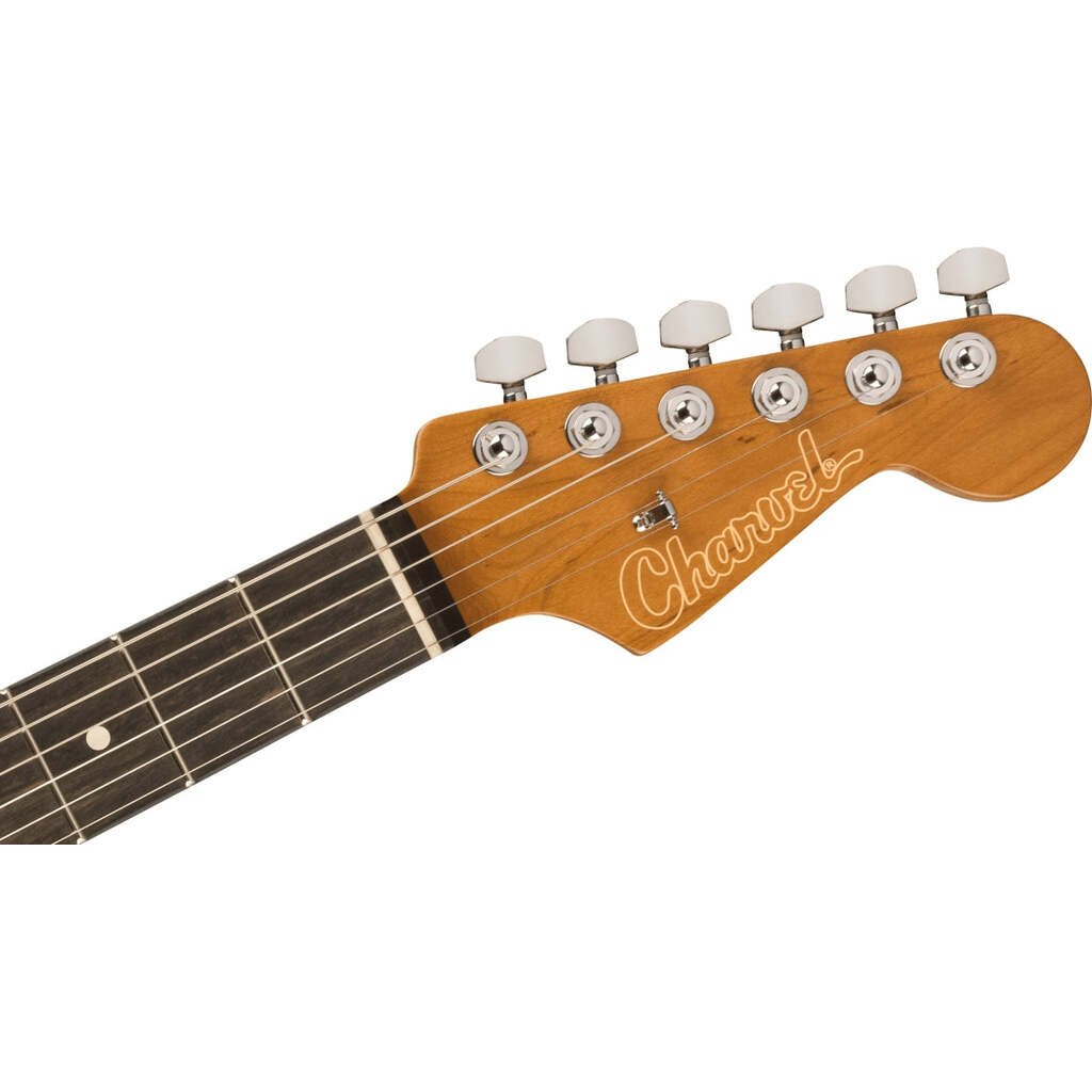 This limited edition Charvel® Super-Stock DKA22 HH 2PT EB comes with an arch body is fashioned from alder and features an elegant black gloss finish. The bolt-on caramelized maple "speed" neck has graphite reinforcement, a silky-smooth hand-rubbed urethane finish, and is topped by a 12"-16" compound radius ebony fingerboard with comfortable rolled edges, 22 jumbo frets and crème dot inlays. A licensed Stratocaster® 6-in-line headstock completes the unique look of this Super Stock axe.