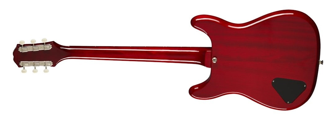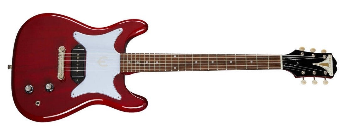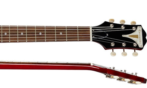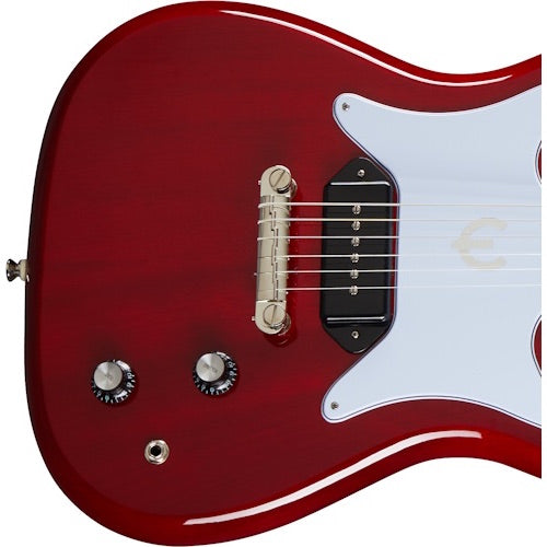 Introduite en 1958, la Epiphone Coronet est l'une des premières guitares électriques à corps solide originales d'Epiphone et l'une des plus réussies. La dernière version reprend de nombreuses caractéristiques des premiers modèles Coronet, notamment le corps symétrique à double pan coupé en acajou avec un seul micro Epiphone PRO P-90 Dogear, trois clés par côtés su rune tête de taille réduite de type Kalamazoo avec l'insigne Epiphone Bikini et des mécaniques à boutons en ivoire et un protège-pic blanc papillon avec le logo E. L'Epiphone Coronet est équipé d'un manche en acajou collé avec un profil C moyen, d'une touche en laurier indien avec un rayon de 12" et 22 frettes jumbo moyennes, d'une commande de volume et de tonalité avec des potentiomètres CTS, et d'un pont enveloppant compensé Epiphone Lightning Bar.