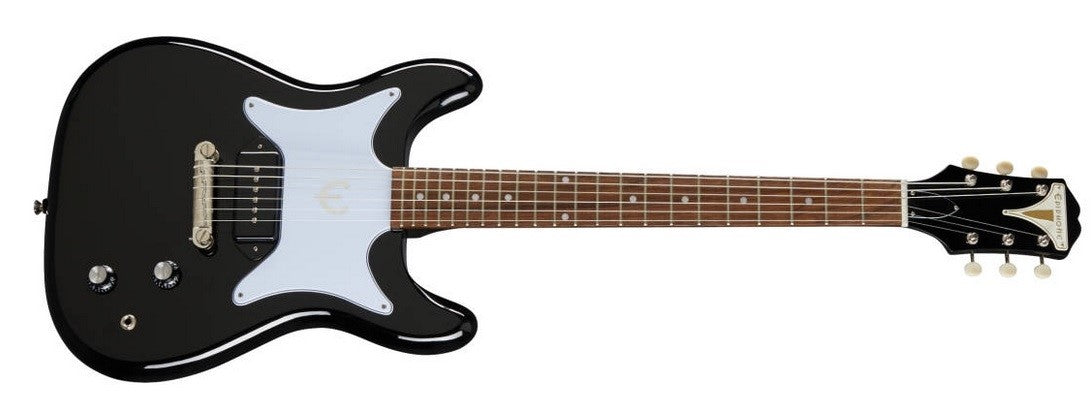 Introduite en 1958, la Epiphone Coronet est l'une des premières guitares électriques à corps solide originales d'Epiphone et l'une des plus réussies. La dernière version reprend de nombreuses caractéristiques des premiers modèles Coronet, notamment le corps symétrique à double pan coupé en acajou avec un seul micro Epiphone PRO P-90 Dogear, trois clés par côtés su rune tête de taille réduite de type Kalamazoo avec l'insigne Epiphone Bikini et des mécaniques à boutons en ivoire et un protège-pic blanc papillon avec le logo E. L'Epiphone Coronet est équipé d'un manche en acajou collé avec un profil C moyen, d'une touche en laurier indien avec un rayon de 12" et 22 frettes jumbo moyennes, d'une commande de volume et de tonalité avec des potentiomètres CTS, et d'un pont enveloppant compensé Epiphone Lightning Bar.