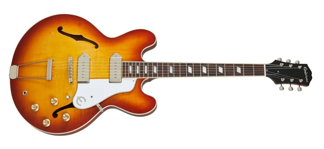 Now made in the USA for the first time in over 50 years! Since its introduction in 1961, the Epiphone Casino™ has been the choice of countless musicians including Paul McCartney, John Lennon, George Harrison, Keith Richards, Ray Davies, Dave Davies, and Paul Weller. The new Casino from the USA Epiphone Collection featuring a classic maple and poplar body with a Royal Tan nitrocellulose lacquer finish (nickel dogear Gibson USA P-90s) or a Vintage Sunburst nitrocellulose lacquer finish (black dogear Gibson USA P-90s). The USA Collection Epiphone Casino also features handwired electronics with Orange Drop® capacitors and Gibson USA P-90 Dogear single-coil pickups. Featuring Gibson Strings.