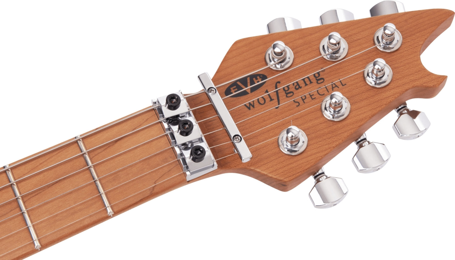Le Wolfgang Special QM se caractérise par un corps en tilleul avec un dessus en érable cintré et un manche en érable cuit renforcé au graphite et scié sur quartier. Le manche est sculpté et roulé selon les spécifications rigoureuses d'Eddie Van Halen’s et présente une finition uréthane satinée, frottée à la main, sur le dos. Préparée pour des performances élevées, des riffs énergiques et des leads flamboyants, la touche 12”-16” en érable cuit à rayon composé possède 22 frettes jumbo et des incrustations de points noirs. Les réglages des truss rod n'ont jamais été aussi faciles grâce à une roue à rayons située à la base du manche.
