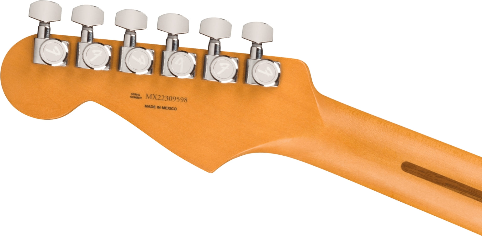 Au cœur de cette Strat® se trouve un trio de micros Player Plus Noiseless™. Ces modèles au son brillant réagissent parfaitement à votre jeu et produisent le son classique de la Strat, mais sans aucun souffle. Un potentiomètre de tonalité push-pull ajoute le micro manche dans les positions 1 et 2 du sélecteur. Vous bénéficiez ainsi de deux sonorités que vous ne trouvez habituellement pas sur une Strat®. Grâce à la douce finition satinée et aux bords arrondis du manche au profil ”Modern C”, votre main glissera sur cette Player Plus Strat® avec aisance. La touche au radius de 12” (305 mm), avec ses 22 frettes medium jumbo, vous aidera à jouer des solos avec une fluidité hors pair et à effectuer des bendings sans faire friser les cordes. Le vibrato à deux points vous servira à produire des effets classiques avec une grande réactivité, et les mécaniques bloquantes vous permettront de maintenir la guitare parfaitement accordée et de changer les cordes en un clin d’œil.