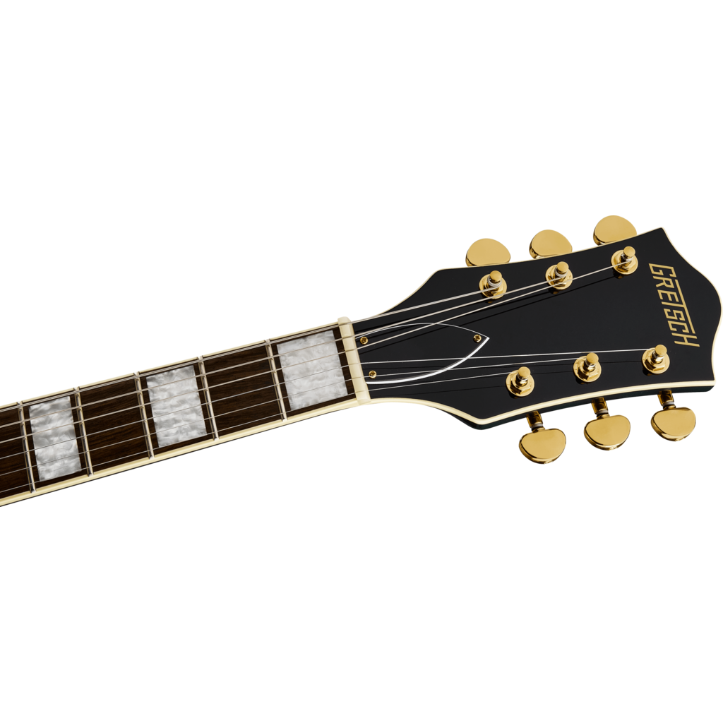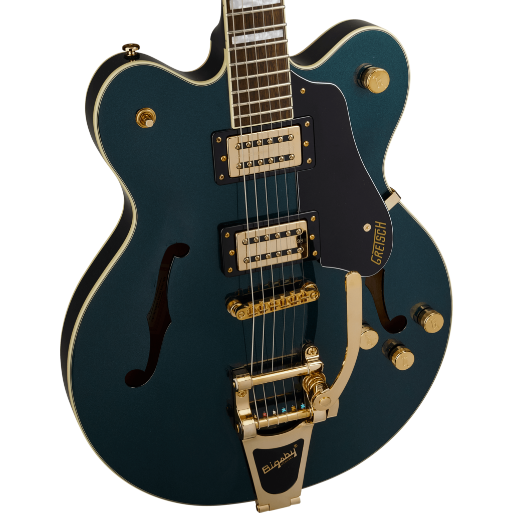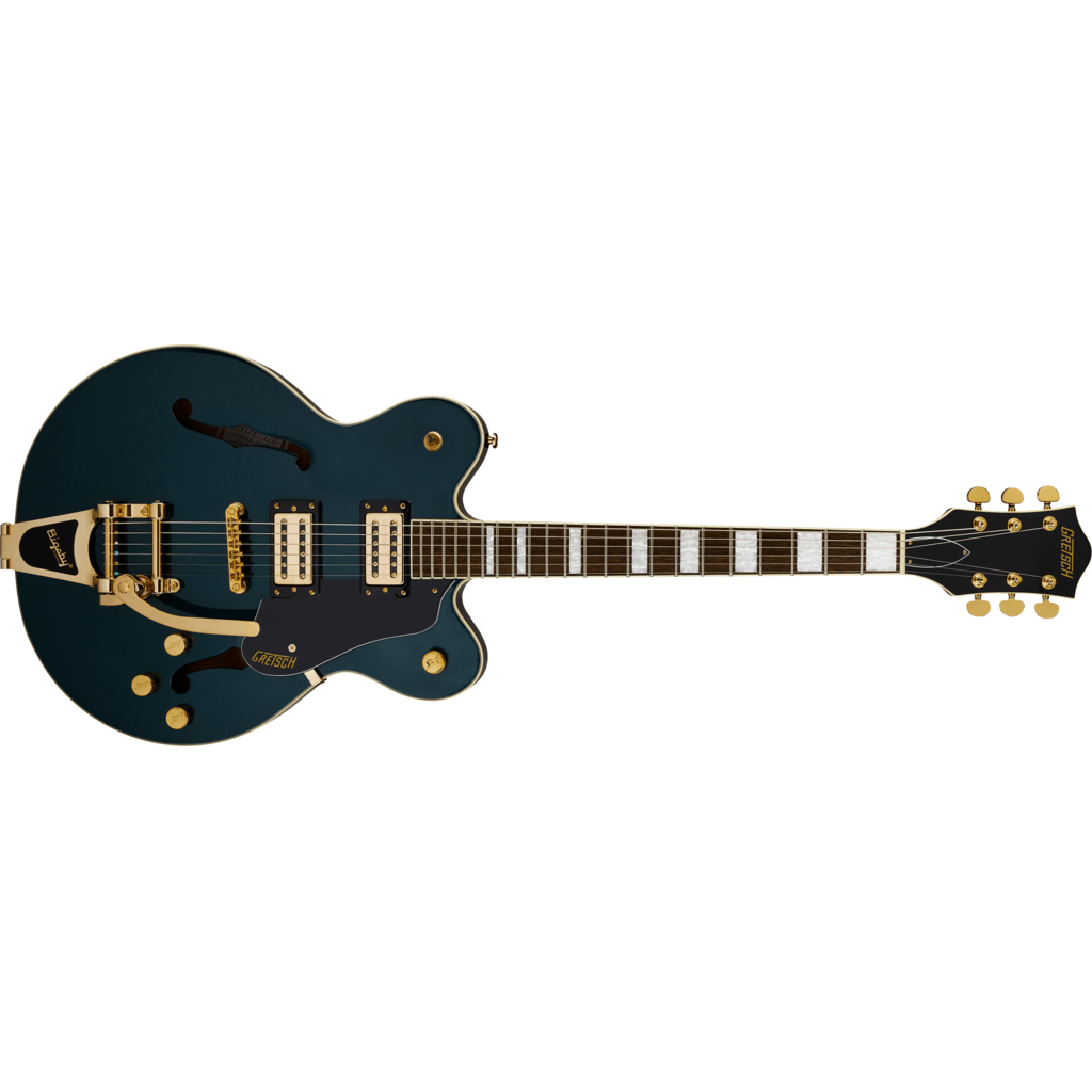 L'édition limitée G2622TG Streamliner Center Block Double-Cut avec Bigsby® fait irruption dans l'ère moderne avec un son et un style puissants. Dotée d'un accastillage doré brillant, de boutons de commande G-Arrow en métal et d'incrustations Big Block en nacre, cette version en édition limitée est conçue pour le guitariste qui exige plus que le banal d'un instrument - plus de performances, plus de style et surtout, plus de volume - tout en conservant tout ce que vous attendez d'une Gretsch.