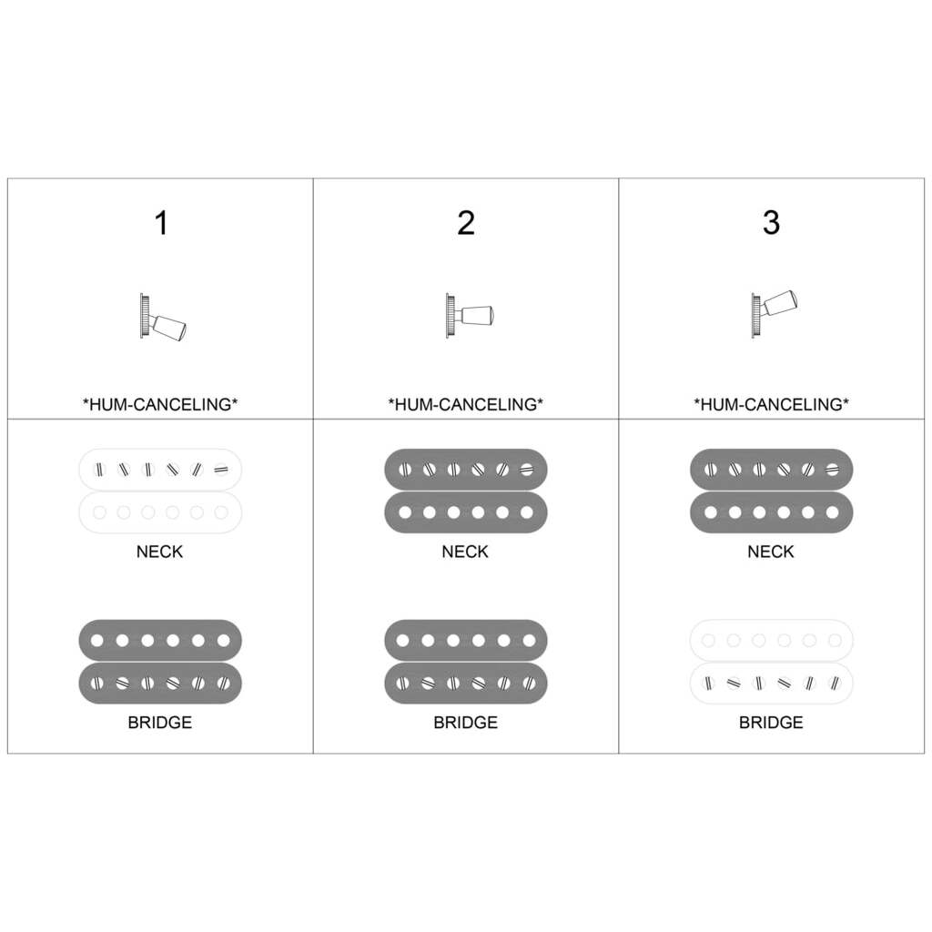 2. Chevalet + manche (Suppresion du bruit): Cette position combine les tonalités des humbuckers manche et chevalet. Des médiums épais et crémeux, des basses rondes et puissantes et des aigus clairs en font un son polyvalent idéal.