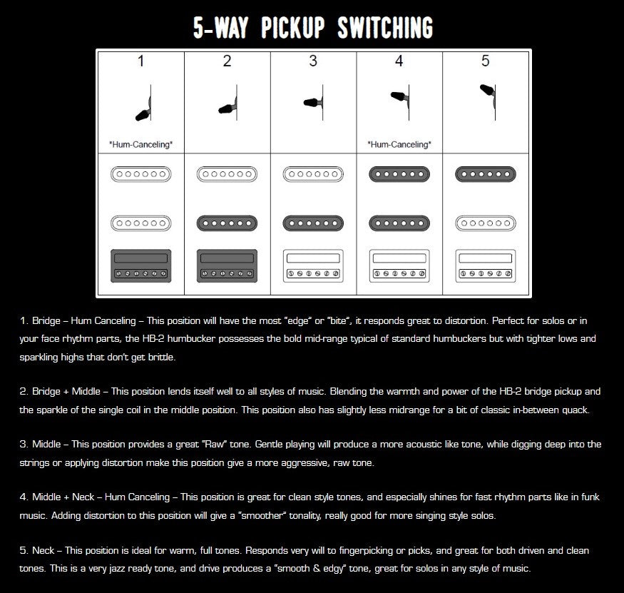 - Pickup Switch: 5-Way Blade: 1. Bridge Pickup - 2. Bridge and Middle Pickups - 3. Middle Pickup - 4. Middle and Neck Pickups - 5. Neck Pickup