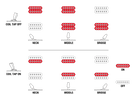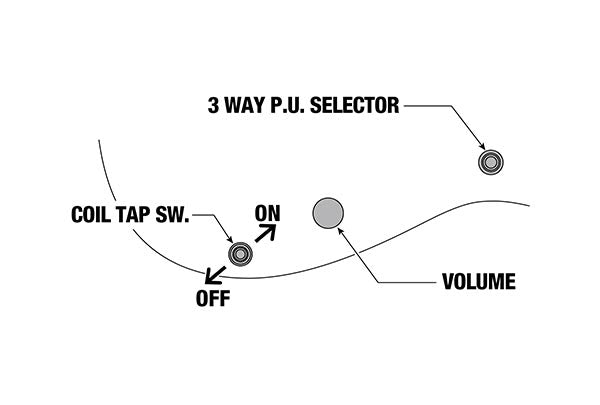 - Lorsque la guitare est tenue en position de jeu, un sélecteur à 3 voies se trouve près de la découpe au niveau du genou, dans la partie inférieure de la guitare. Le bouton de volume et le commutateur de bobine « coil-tap » sont situés vers l'extrémité du corps. Lorsque le commutateur de bobine « coil-tap » est incliné vers le bouton de volume, la bobine « coil-tap » est activée, et lorsqu'il est incliné dans le sens opposé, la bobine « coil-tap » est désactivée.