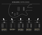 Son électronique intégrée au pickguard comprend un micro PRS DS-01 en position aiguë, offrant un son brillant et incisif, tandis que le micro PRS Narrowfield en position grave confère à la Vela un mordant remarquable. Le split du micro aigu, via le contrôle de tonalité, permet de passer en mode simple bobinage, offrant ainsi une plus grande polyvalence sonore.