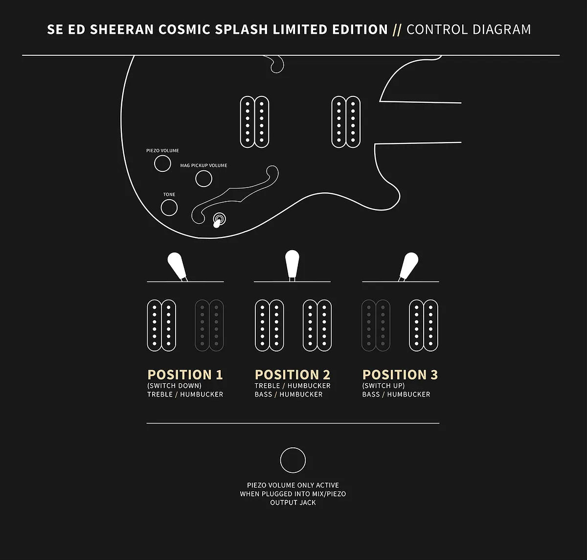 - Conçu en collaboration avec Ed Sheeran, ce modèle SE à corps creux I à piézo baryton allie la passion de Sheeran pour la composition musicale à son amour pour la peinture en dehors de la scène. Limité à 1 000 exemplaires, le SE « Cosmic Splash » de PRS présente un revêtement reprenant exactement le motif de l'une des peintures de Sheeran intitulée « 2025 Cosmic Carpark ». L'incrustation est une ode à la prochaine série d'albums du musicien, chacun portant le nom d'un symbole multimédia - « Play », « Pause », « Rewind », « Fast-Forward » et « Stop ». L'icône « Play » figure également sur le couvert du truss rod.