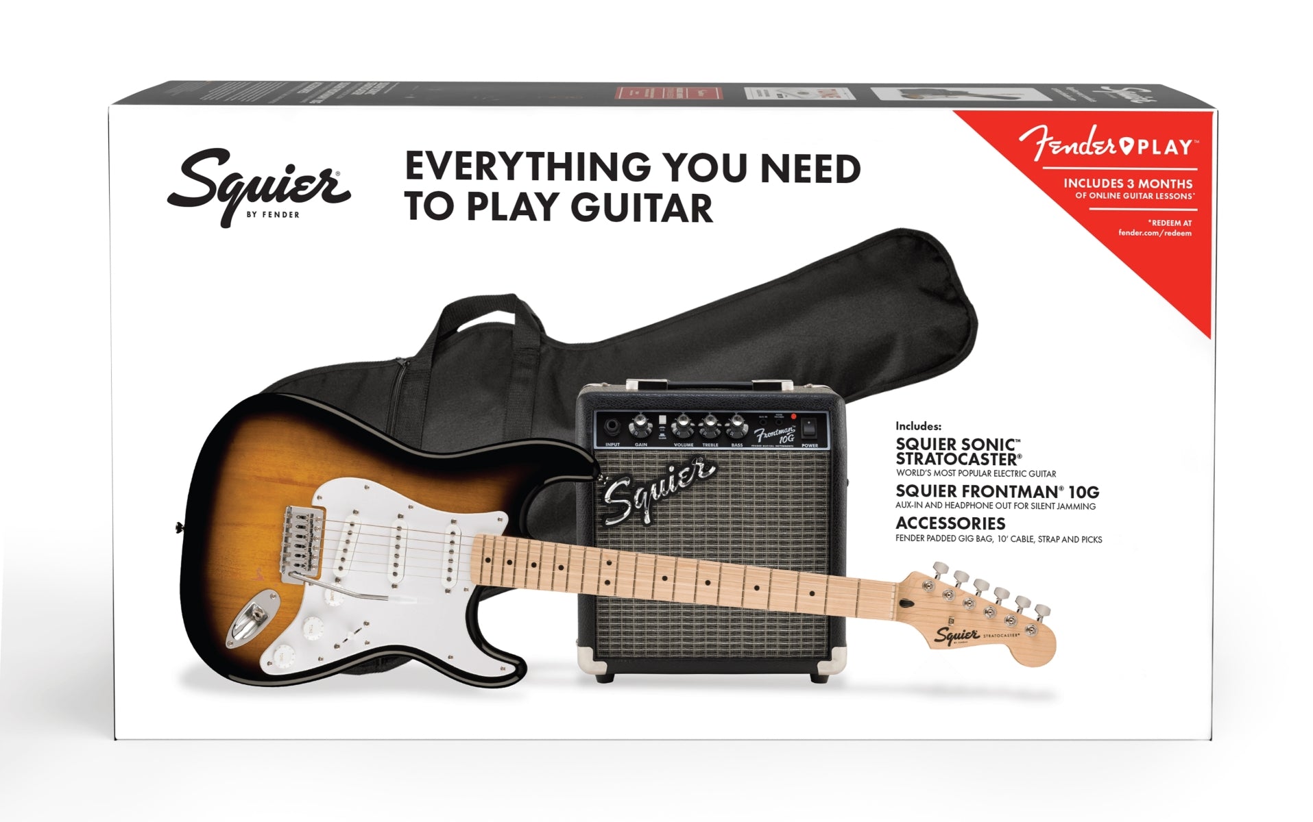 Le pack Squier Sonic® Stratocaster® réunit tout le matériel de guitare indispensable dans un kit très pratique, pour que les artistes en herbe puissent se lancer dans leur aventure musicale à la sans perdre une minute. La Stratocaster est une icône dans l’histoire de la musique. Célèbre pour son corps profilé, confortable et élégant, ainsi que pour son manche fin et facile à jouer, c’est l’instrument idéal pour débuter. Ses trois micros à simples bobinages produisent un son polyvalent et inspirant, parfait pour tous les styles musicaux, et son vibrato permet de réaliser des effets expressifs qui vous donneront des tonnes d’idées. Le Squier® Frontman® 10G est un amplificateur compact et facile à transporter, qui présente des canaux clair et saturé, un égaliseur de deux bandes pour modeler votre son, une sortie casque pour vous entraîner sans déranger votre entourage, et une entrée auxiliaire pour brancher un lecteur multimédia. Le pack contient également une housse matelassée, un câble d’instrument, une sangle et des médiators, ainsi qu’un abonnement gratuit de trois mois à Fender Play® - la solution la plus simple pour apprendre à jouer de la guitare.