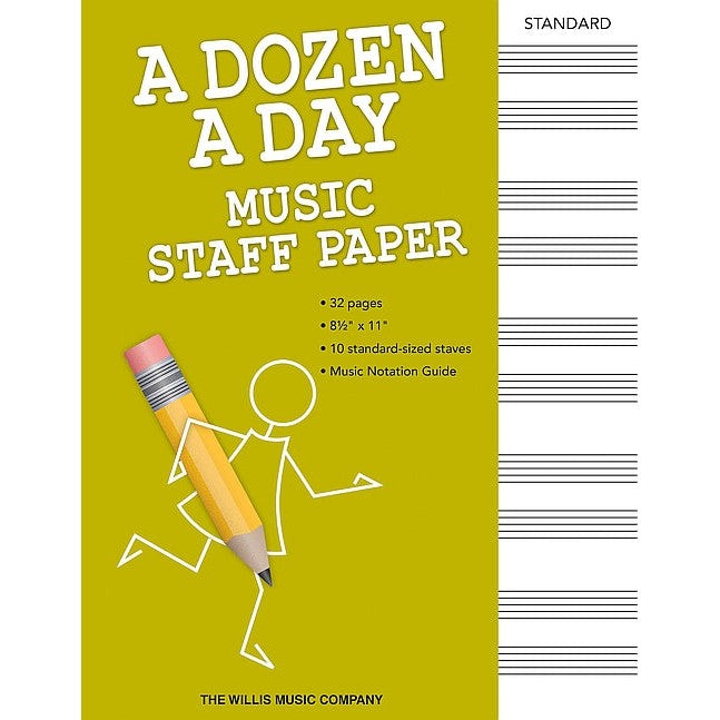 32 pages de papier de portée 8,5 x 11 avec 10 portées de taille standard par page, un guide de notation musicale et présentant les figurines amusantes en bâton de la série originale A Dozen a Day (qu'Edna Mae Burnam elle-même a dessinée !) sont présentées dans ce livre papier manuscrit.