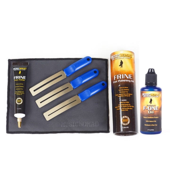 MusicNomad Total Fretboard Care Kit gives you all the products to restore, maintain and protect your frets and fretboard wood to give it that showroom look and feel. Start by using MusicNomad's Frine fret-polishing kit that will not only make bending and vibrato easier, but prolong your string life. Oxidized, dirty frets cause more string damage than you'd think. MusicNomad's Frine fret-polishing kit contains everything you need to give your frets an eye-glaring, clean shine. The specially formulated Frine fret polish has micro-fine polishing compounds that safely and quickly remove oxidation, dirt and oil. MusicNomad's innovative fretboard guards and premium microfiber cloth are designed to make it safe and super-easy. The second step is to use MusicNomad's F-One that's formulated using a complex mixture of the finest ultra-refined oils to clean, condition, and protect your unfinished fretboard. This product is 100-percent free of any lemon extracts, waxes, petroleum distillates, detergents, and water. It leaves your fretboard looking new, playing great, and feeling smooth, never sticky or tacky. Developed using only naturally produced oils, F-One gives wood its life back. Look, sound & play the best!