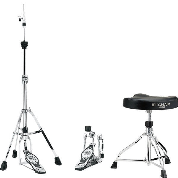 This hardware pack consists of Iron Cobra 200 series hardware and a 1st Chair Saddle-Type Seat Drum Throne. Included is one (1) HP200P Single Pedal, one (1) HH205S Hi-Hat Stand, and one (1) HT250 1st Chair Saddle-Type Seat Drum Throne.