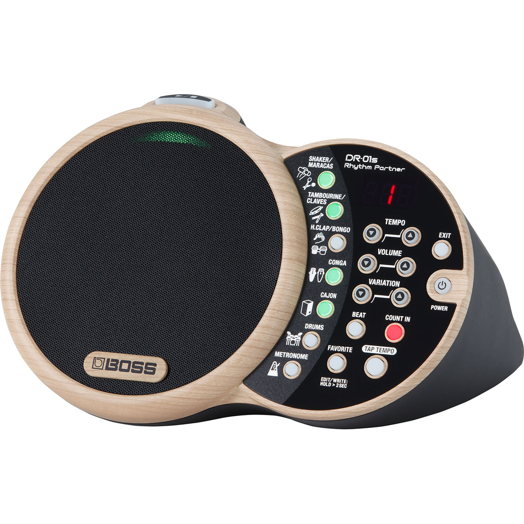 DES GROOVES ORGANIQUES POUR LES MUSICIENS ACOUSTIQUES Voici le Rhythm Partner DR-01S, le premier percussionniste virtuel au monde conçu spécialement pour les musiciens acoustiques. Au contraire des boîtes à rythme utilisées par les musiciens électroniques et les DJs, la DR-01S contient des sons de percussion organiques et des grooves simples et polyvalents, qui apporteront un accompagnement raffiné à vos concerts acoustiques. C'est un instrument idéal pour accompagner les guitares acoustiques et les voix, mais aussi le ukulele, le violon, le piano et autres instruments acoustiques. L’interface conviviale du DR-01S permet de trouver facilement le beat et la variation qui convient à chaque style, tandis que le haut-parleur intégré fournit un son haute qualité qui complète harmonieusement celui des instruments acoustiques. Et grâce à son fonctionnement sur piles, vous pouvez l’emporter partout. Que vous jouiez en solo ou avec un ami, la DR-01S vous apportera inspiration et plaisir supplémentaires lors de vos sessions en acoustique. CARACTÉRISTIQUES BOSS Rhythm Partner DR-01s : Boîte à rythme Polyphonie maximum 24 Tempo 40–300 Signature temporelle 3/4, 4/4, 6/8 Sons Shaker Maracas Bell Whistle Tambourine Pandeiro Claves Cowbell Triangle Guiro Bongo Hand clap Paila Conga Cajon Drums Metronome Sound effects Nombre de favoris 50 Sortie de puissance nominale 7 W Haut-parleur 10 cm Écran 7 segments, 3 caractères (DEL) Conversion DA 24 bits Niveau d’entrée nominale AUX IN : -20 dBu Impédance d’entrée AUX IN : 22 k? Niveau de sortie nominale LINE OUT : -10 dBu Impédance de sortie LINE OUT : 1 k? Impédance de charge recommandée LINE OUT : 10 k? ou plus Connecteurs Prise AUX IN Mini-jack stéréo Prise LINE OUT Mini-jack stéréo Prise CTL 1, 2 Jack TRS 6,35 mm Prise DC IN Alimentation Pile alcaline (AA, LR6) x 6 (vendues séparément) Adaptateur secteur Consommation 330 mA Durée de vie prévue des piles en cas d’utilisation continue Alcaline : 10 heures environ * Ces chiffres varient en fonction des conditions réelles d’utilisation. Dimensions 210 (L) x 143 (P) x 127 (H) mm Accessoires Mode d’emploi Dépliant « CONSIGNES DE SÉCURITÉ » Adaptateur secteur