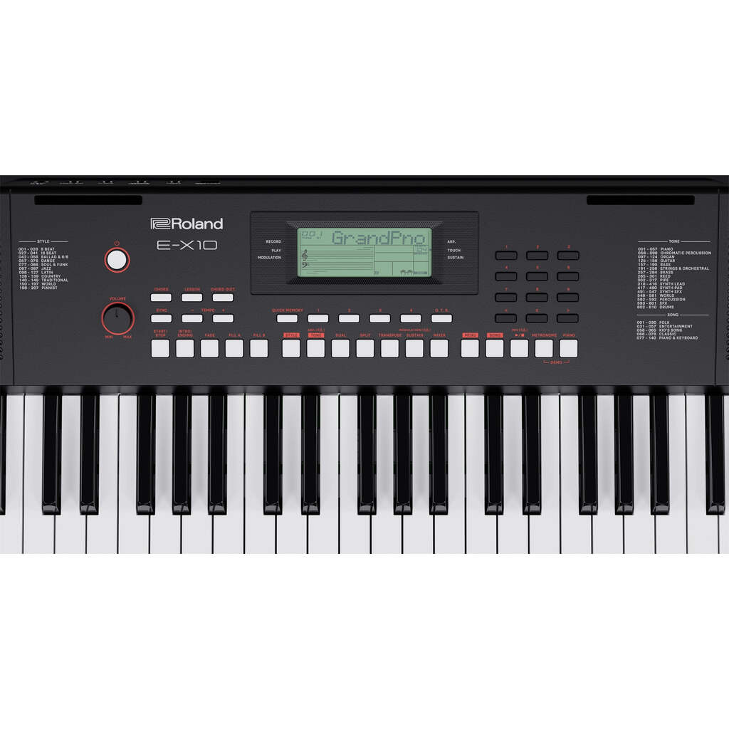 Launch your musical journey with the E-X10, an inspiring starter keyboard with quality features derived from professional Roland instruments. Have fun as you learn with expressive acoustic pianos and hundreds of other sounds. Command a full band with auto-accompaniment and connect a mic to sing along. Record keyboard performances to check your progress. And play anywhere with the sleek portable design, onboard stereo speaker system, and support for battery-powered operation.