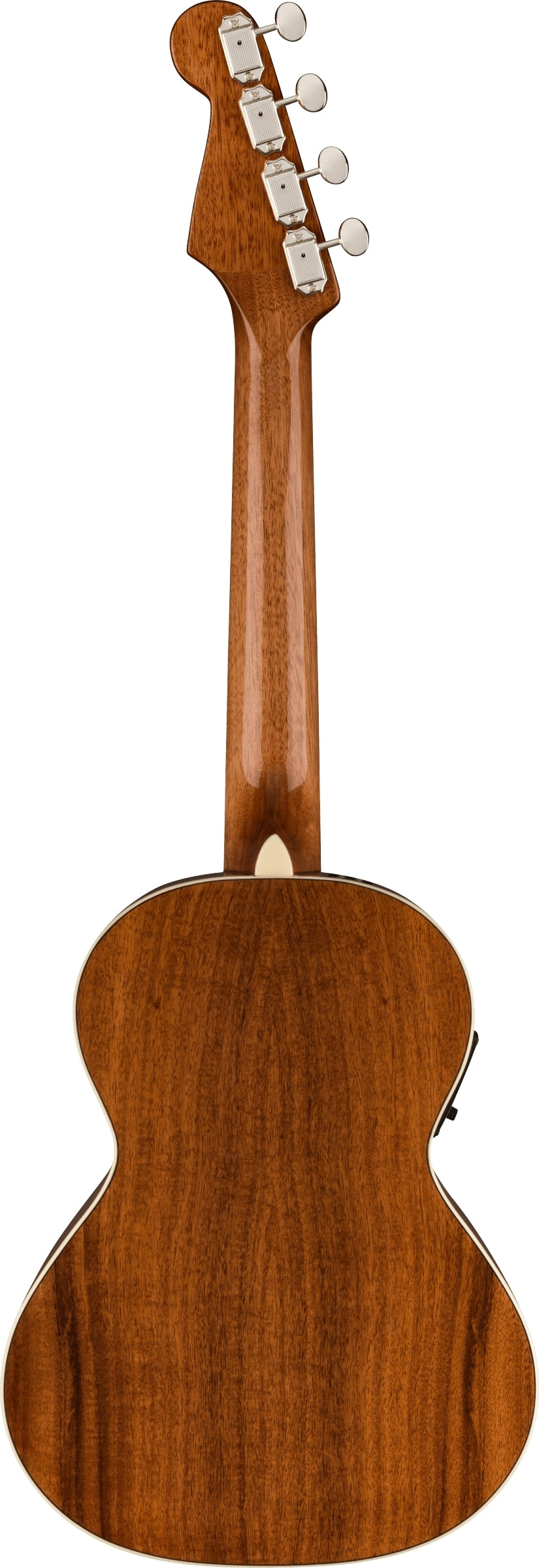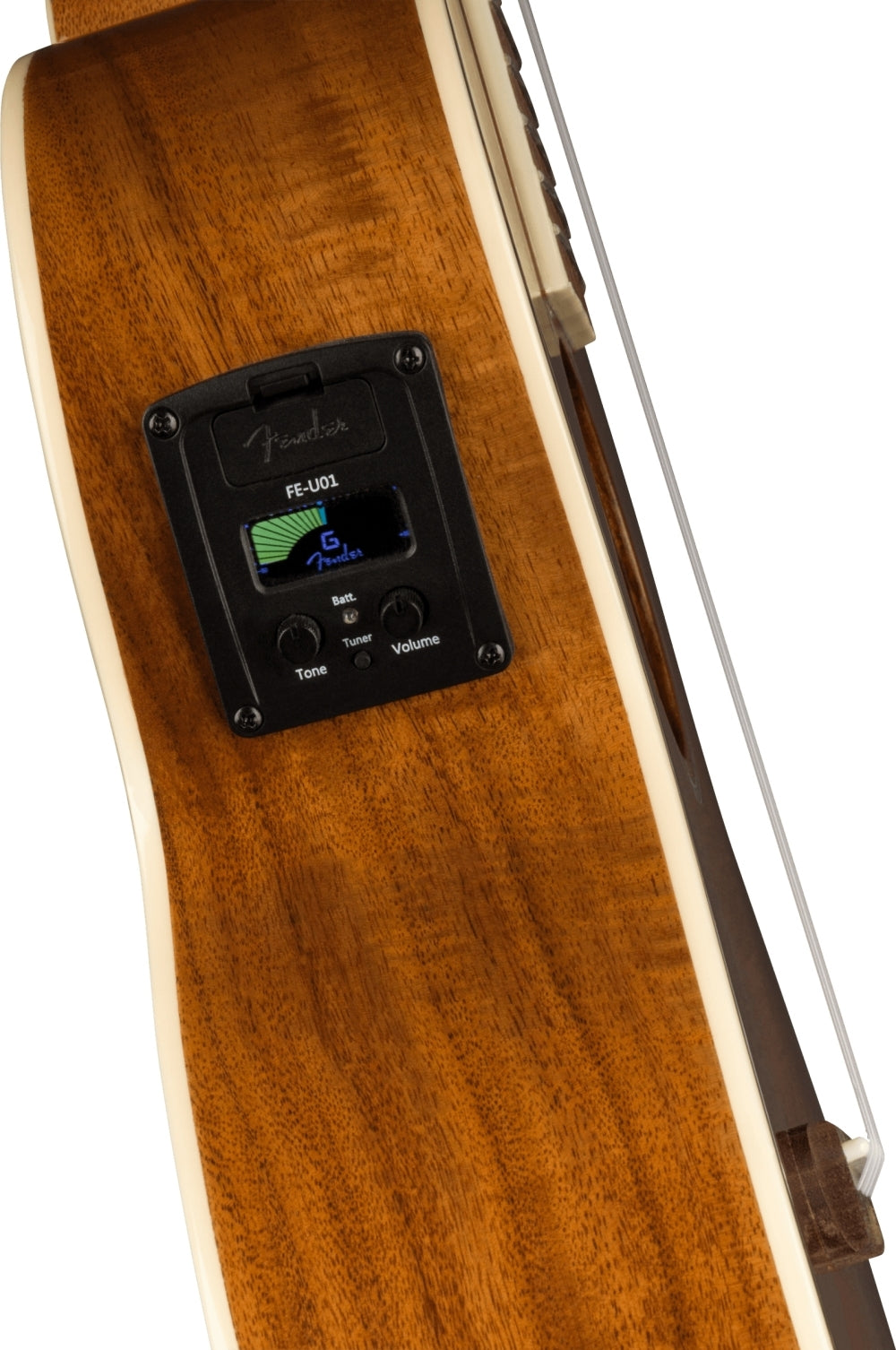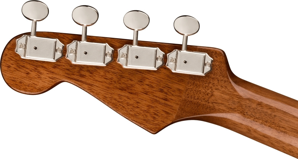 Ce ukulélé présente également un chevalet « no-tie » facilitant le changement des cordes, ainsi que des sillets de tête et de chevalet en os qui produisent une intonation supérieure. Une superbe finition brillante, des mécaniques fermées de style vintage et une tête de manche de Strat® avec 4 mécaniques en ligne complètent le look indéniablement classique de Fender.