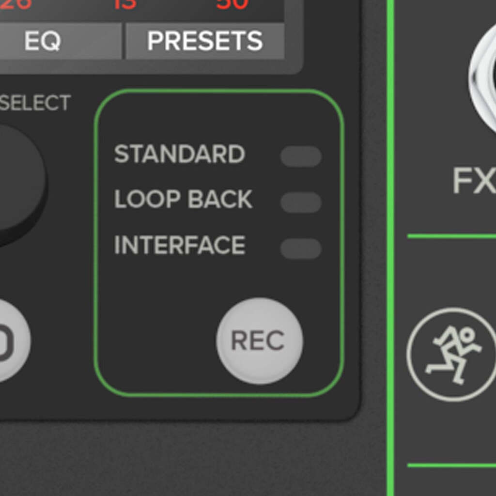 - Trois modes d‘enregistrement USB : Standard (avec effets), Loopback (avec renvoi du son de l‘ordinateur) et Interface (canaux 1-2 sans effets)