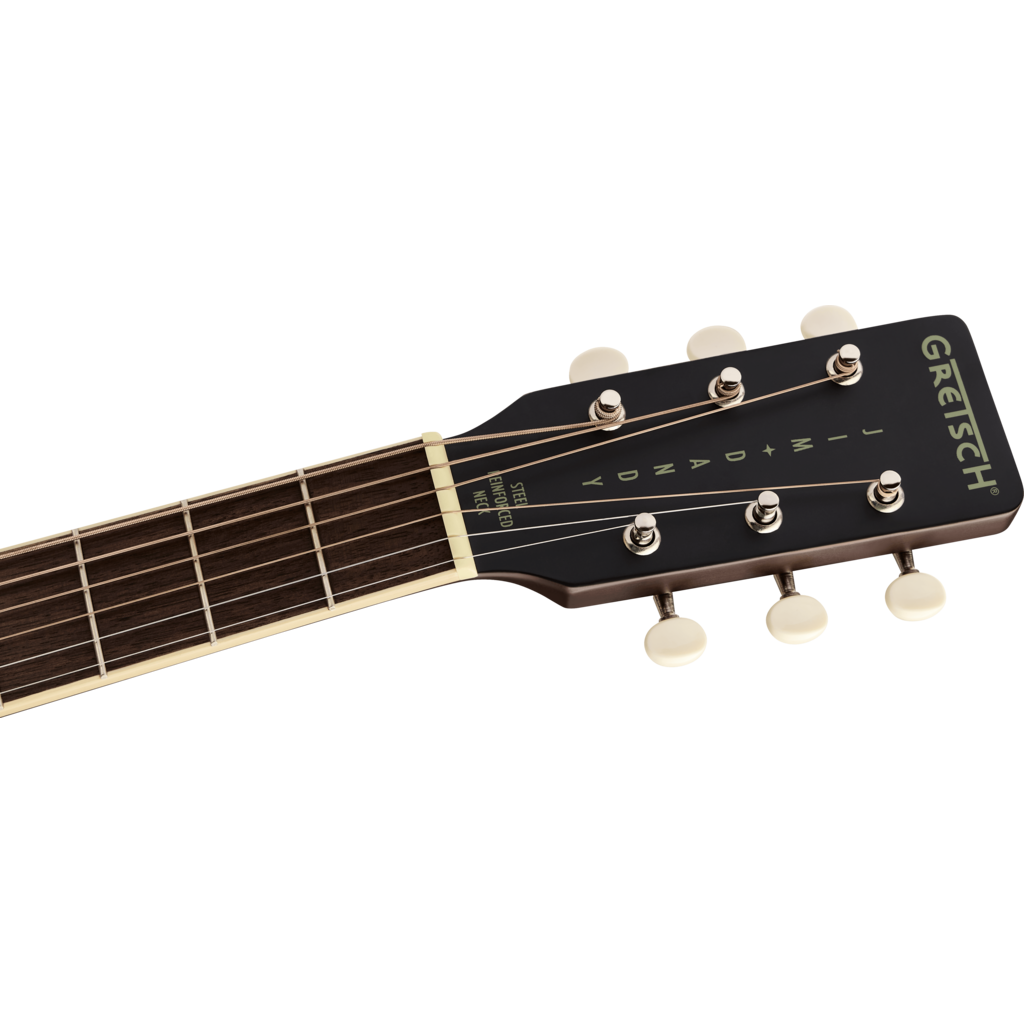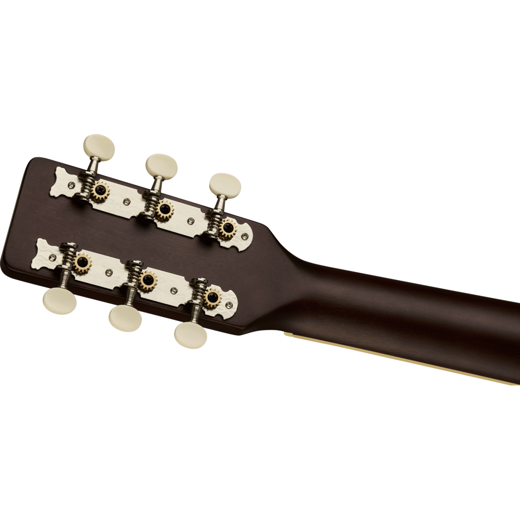 Le corps à barrage en X est fabriqué avec des bois stratifiés légers sélectionnés pour un équilibre optimal entre sonorité vintage et durabilité fiable, tandis que le manche en « C » offre une sensation invitante pour des heures d'inspiration rétro. Des détails d'époque, tels qu'un chevalet à goupilles de style vintage, une plaque de protection à motif « G », des filets à rayures peintes, des mécaniques à engrenages ouverts 3 sur plaque et des incrustations de touche à points surdimensionnés, lui confèrent une personnalité nostalgique idéale pour tous les festivals et fêtes.