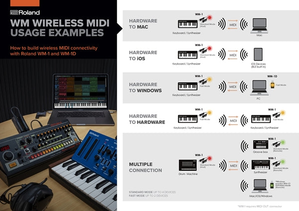 Les Mac et terminaux iOS peuvent communiquer avec les appareils WM en mode Standard par MIDI Bluetooth. Mais lorsque vous avez besoin de la plus grande vitesse de transfert possible, il vous suffit d'utiliser un WM-1D.