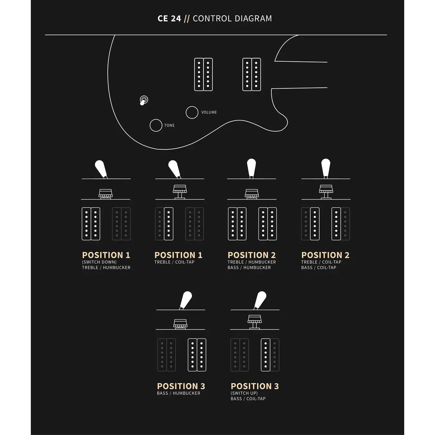 Pour optimiser encore davantage le timbre et la clarté de la guitare, la CE 24 est équipée de micros PRS 85/15, conçus pour une clarté optimale dans les aigus et les graves. L'électronique comprend un contrôle de volume et de tonalité push/pull avec sélecteur 3 positions, pour un total de six sons classiques.