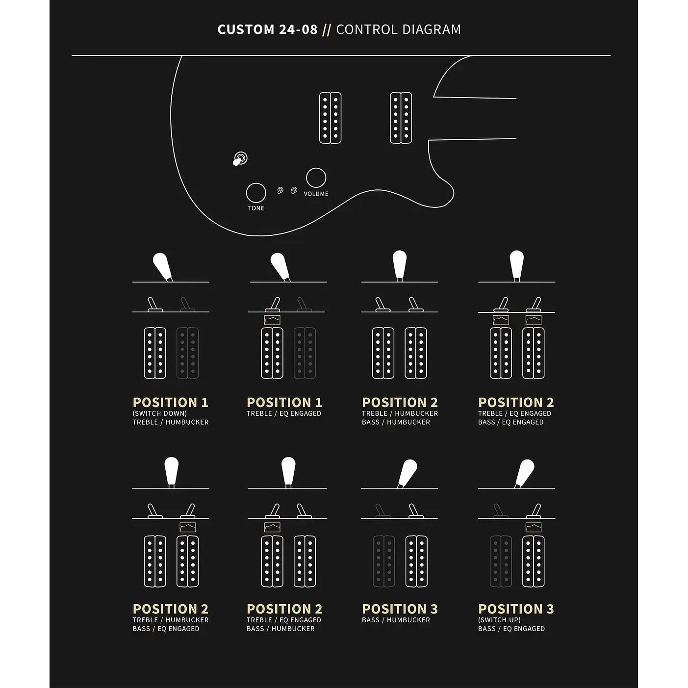 - Commandes : Contrôle du volume et de la tonalité avec commutateur de micro à bascule à 3 positions et deux mini-interrupteurs à bascule d'égalisation
