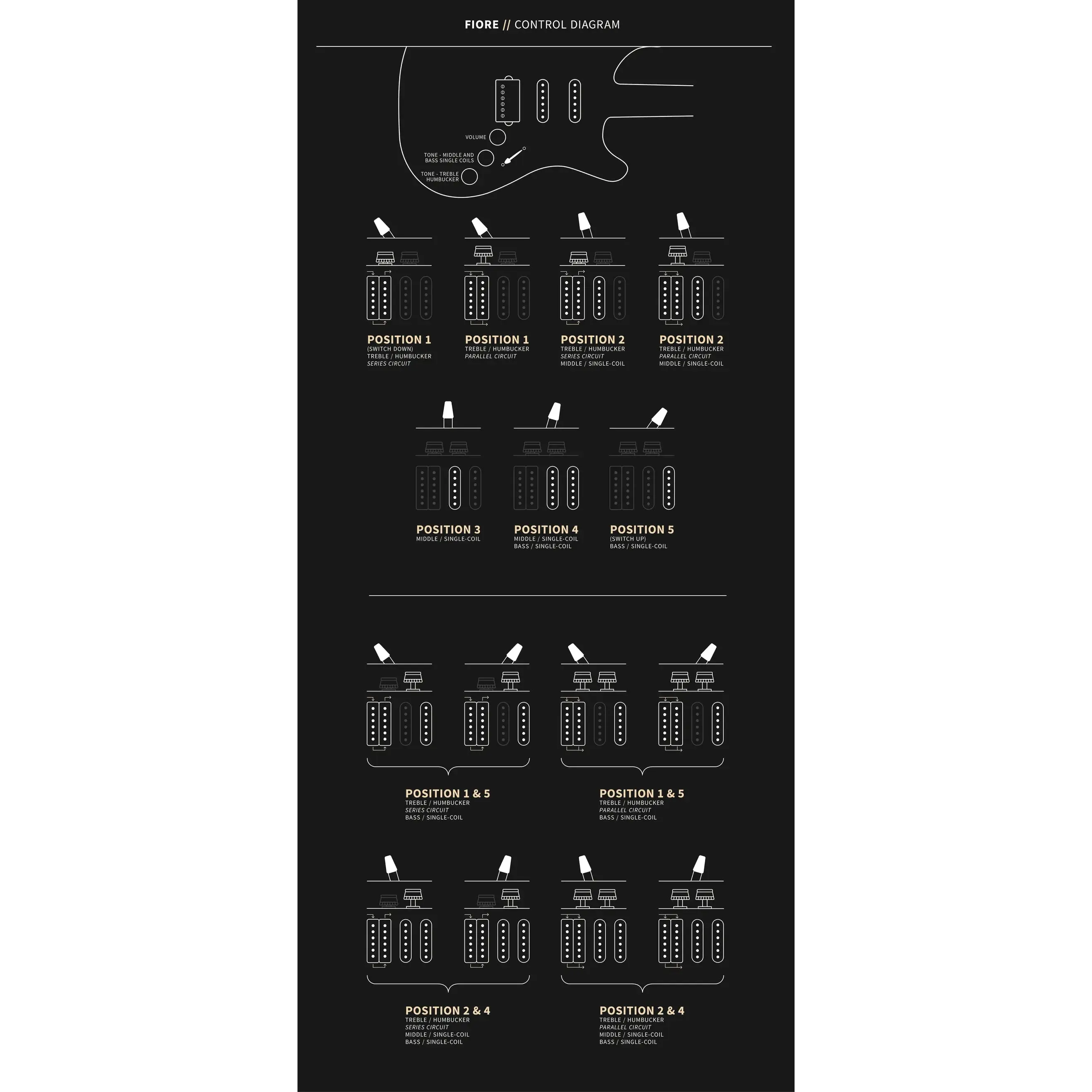 Mais l'exploration sonore ne s'arrête pas là. Le modèle Fiore est équipé d'un sélecteur à lame 5 positions avec câblage traditionnel (chevalet / chevalet + milieu / milieu / milieu + manche / manche). La Fiore dispose également d'un volume unique et de deux commandes de tonalité push/pull, ce qui optimise encore les possibilités de modelage du son de cette guitare.