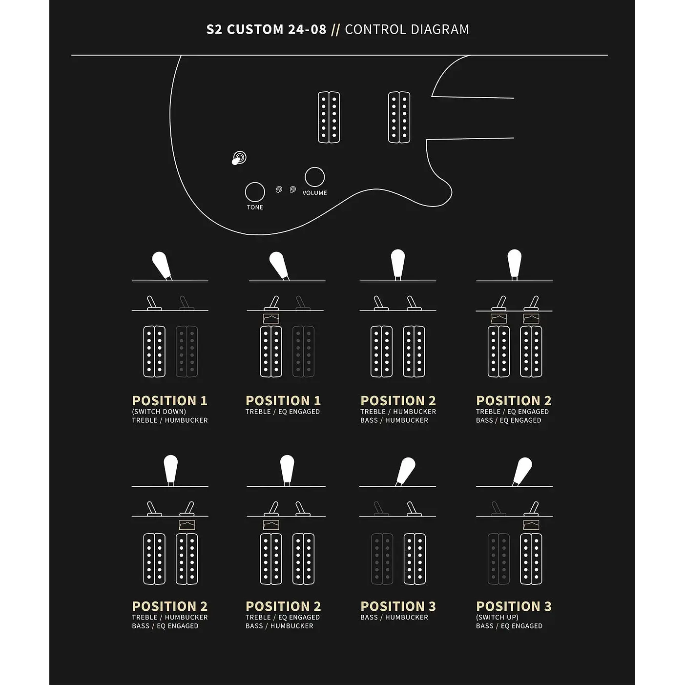 La S2 Custom 24-08 partage de nombreuses caractéristiques avec la S2 Custom 24, mais gagne en polyvalence grâce à son système de commutation intuitif. Elle est équipée d'une table en érable, d'un dos et d'un manche en acajou, ainsi que d'une touche en palissandre avec incrustations d'oiseaux. Elle est équipée de 24 frettes, d'un manche fin à motif de 25 pouces, du vibrato Gen III breveté par PRS et de mécaniques Phase III avec axes et boutons en laiton non plaqué.