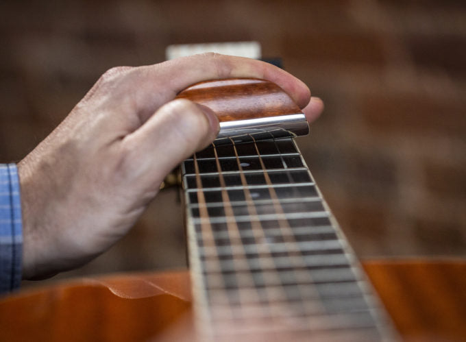 Nous avons passé un bon moment à parler de ses barreaux, et j'ai appris à quel point il avait réfléchi et s'était occupé de leur développement. L'histoire de l'acier pour guitare a été une évolution qui s'est éloignée de l'"objet trouvé" pour se rapprocher d'un outil plus spécialisé et plus ergonomique. J'ai vite compris qu'il avait fait non seulement l'étape suivante de cette évolution, mais aussi les deux ou trois étapes suivantes en même temps. Outre son utilisation créative des matériaux, il avait sculpté la forme des sommets de ses barres de façon à ce que votre main s'y pose dans la position la plus étonnamment détendue et naturelle qui soit. Il avait soigneusement étudié chaque angle, chaque surface, chaque rayon. De son bord, conçu pour offrir les coups nets que les joueurs d'aujourd'hui adorent, à la poignée lestée et contrebalancée, cette barre est à peu près aussi éloignée d'un "objet trouvé" que vous pouvez l'être.