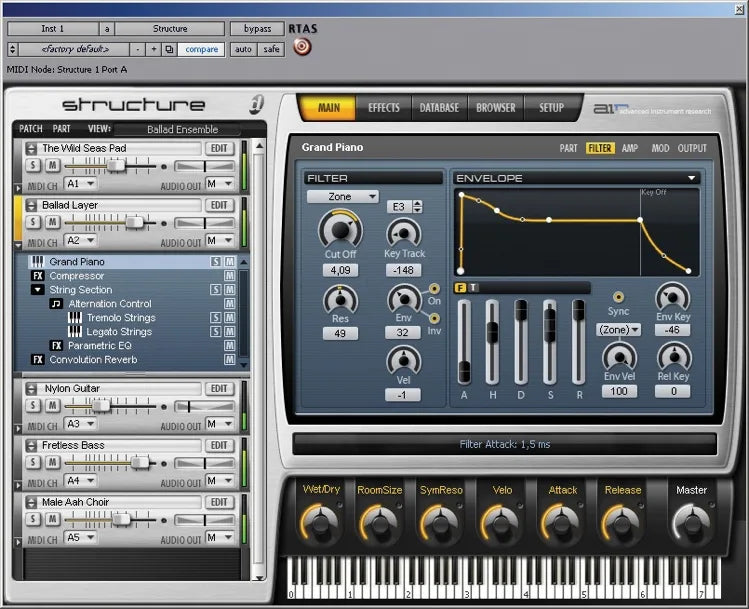 * Multitimbral 128 notes (pour chaque exemplaire de Structure activé dans la session), nombre illimité de parts, d’effets audio et d’effets MIDI par patch