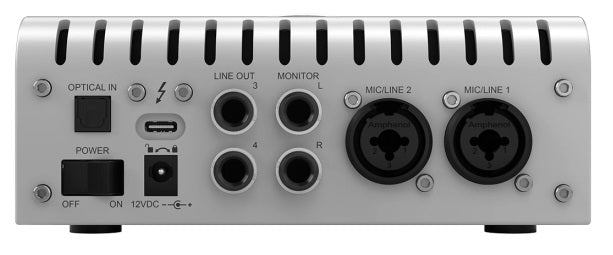 • Deux préamplis micro Unison™, entrée instrument Hi-Z, entrée optique Toslink (ADAT ou S/PDIF)