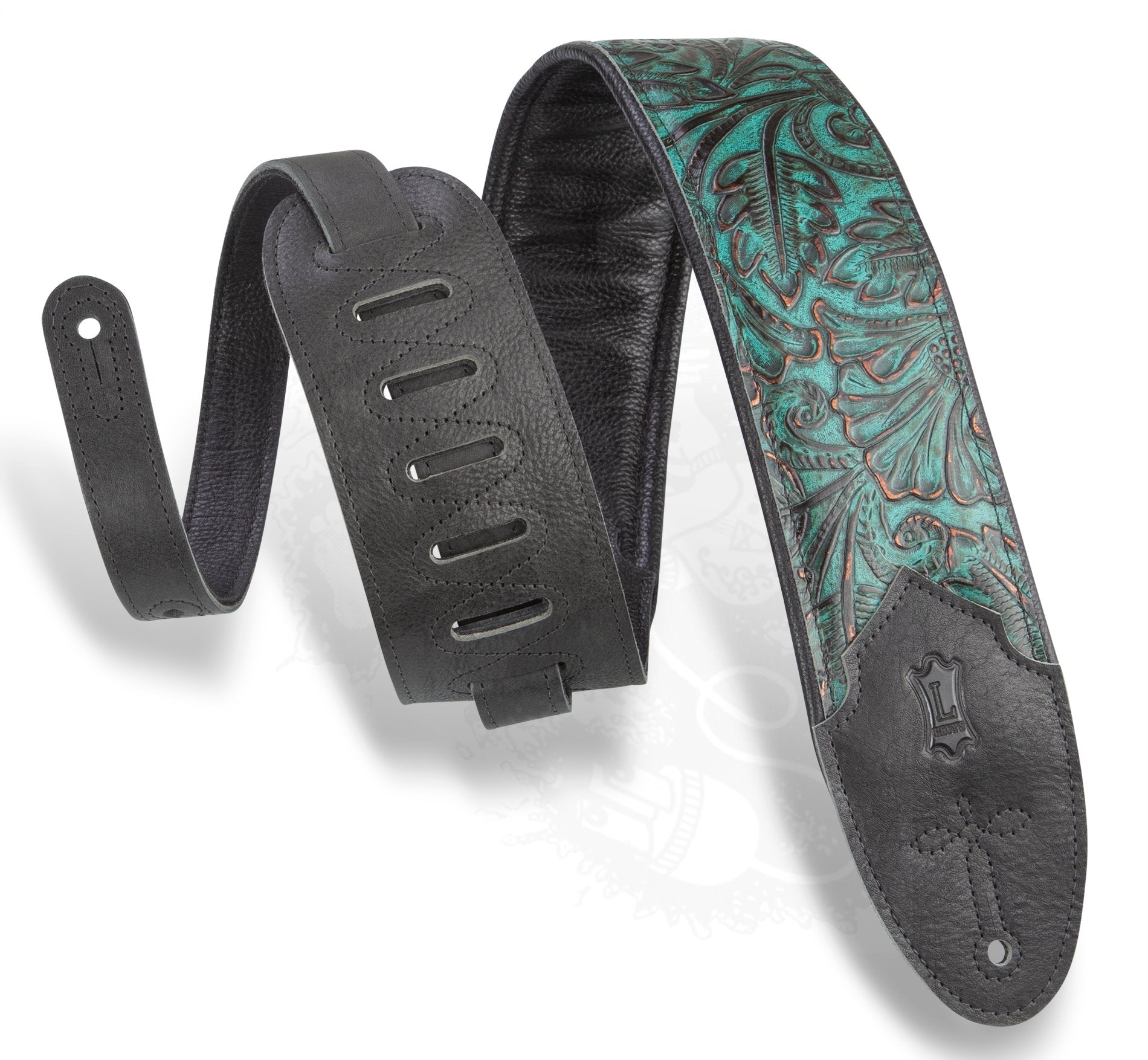 3″ Embossed Leather Guitar Strap With Supple Padding and Garment Leather Backing. 2-ply Strap Features Distressed Large Palm Embossed Leather In Turquoise With Bronze Undertones And Black Soft Garment Leather Backing. Western Style End Tabs showcase Flore