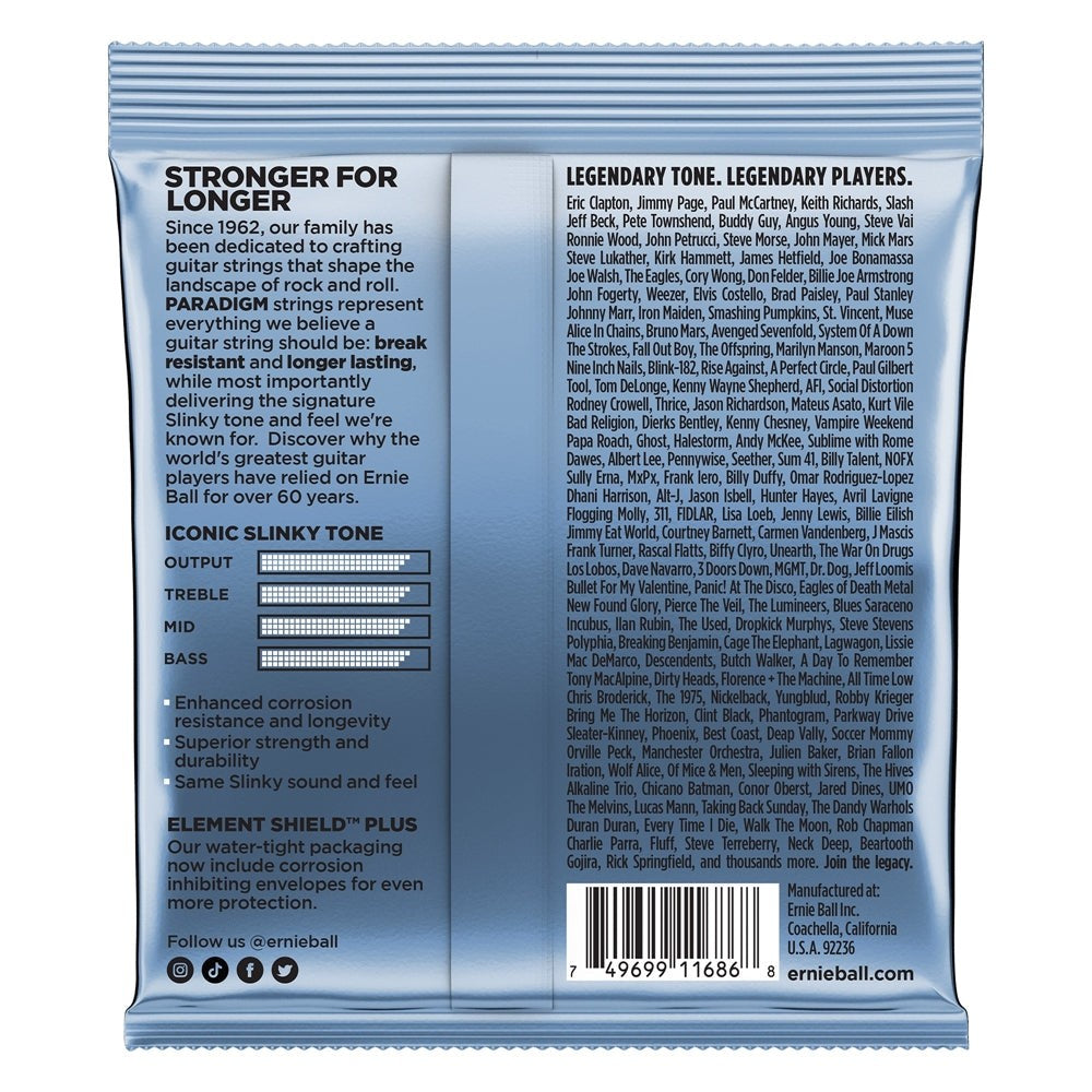 Ernie Ball Slinky Paradigm Electric Guitar Strings provide unprecedented strength and longer life while retaining 100% Slinky tone and feel. Ernie Ball's industry-leading ultra-high strength steel is included in both the wound and plain strings along with a patented reinforcement at the ball-end twist of each plain string to provide superior tensile and fatigue strength for strings that lock into tune fast and hold up under the most stressful playing styles and conditions. The coupling of Ernie Ball's Everlast nanotreatment with breakthrough plasma-enhanced wrap wire provides added corrosion resistance and reduced accumulation of tone-robbing buildup and debris. Experience the first set of longer-lasting strings that are worth playing with all benefits and no compromises. Gauges 0.0095, 0.012, 0.016, 0.024, 0.034, 0.044.