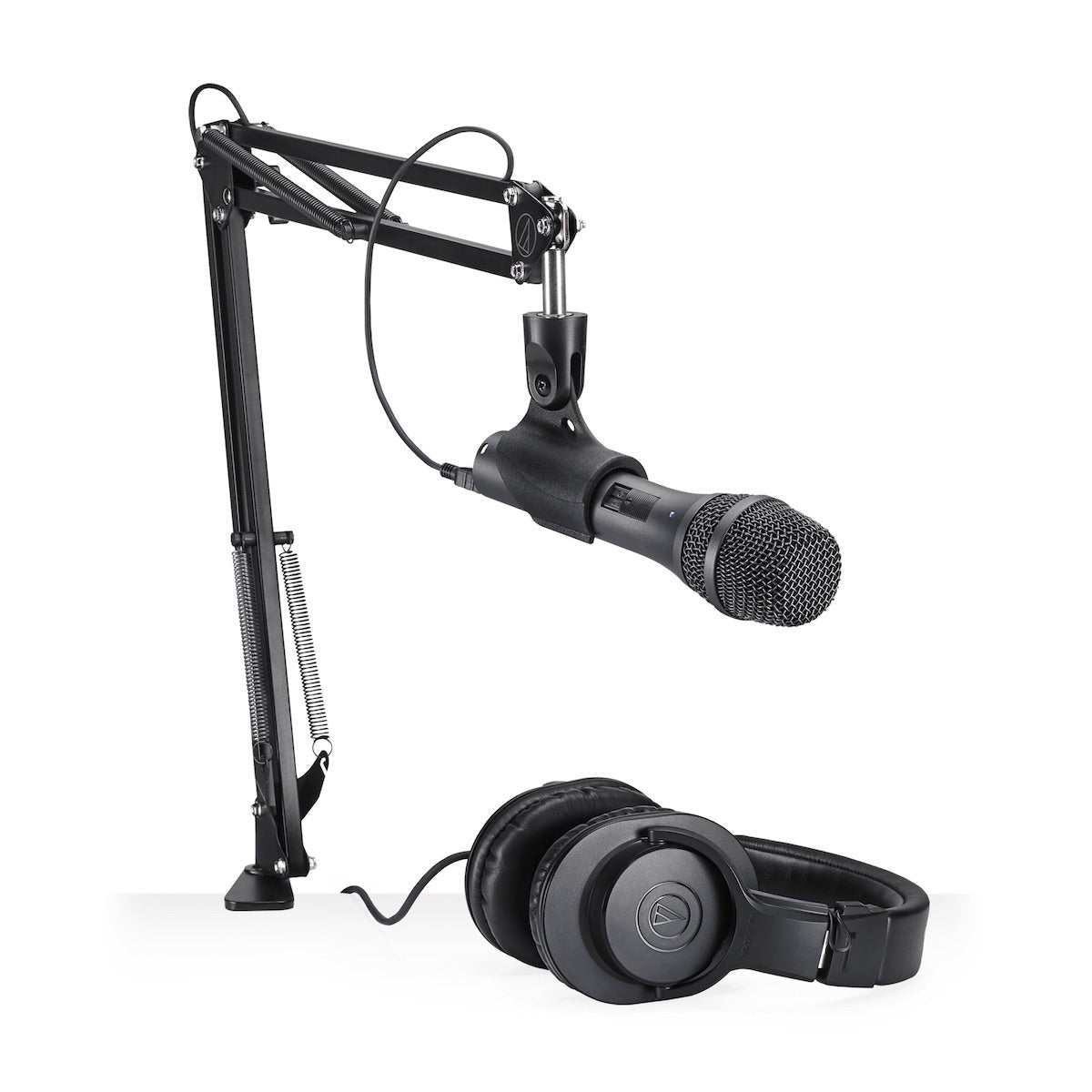 Le pack comprend un microphone dynamique cardioïde USB/XLR AT2005USB, une paire de casques d'écoute professionnels ATH-M20x et un bras de perche de studio muni d'un câble USB.