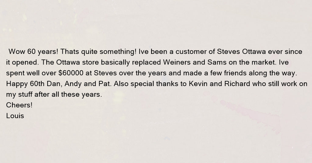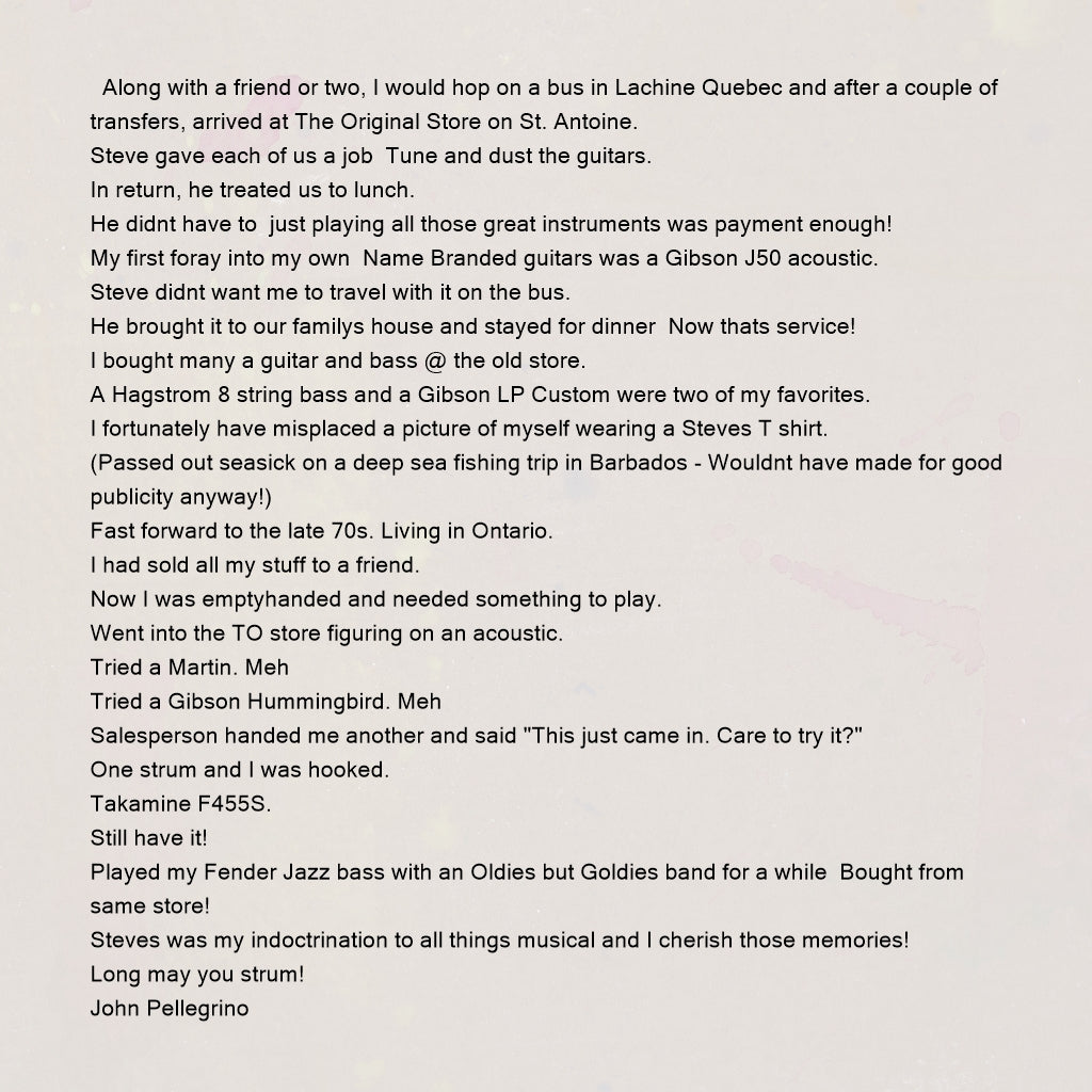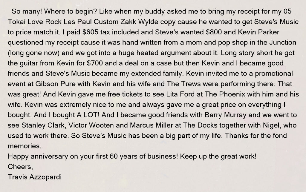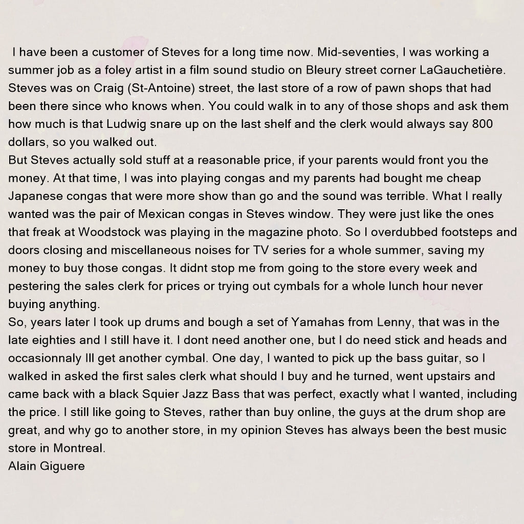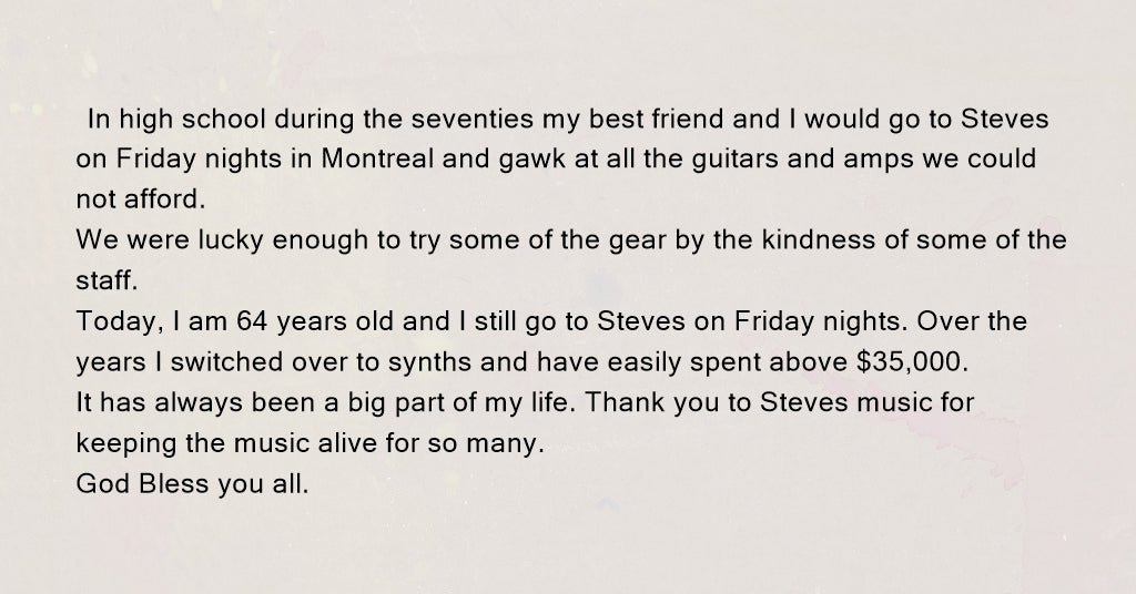 From your modest beginnings to today, I say congratulations for bringing thejoy of music to my life. I’ve been a customer since 1968 and still play musictoday thanks to Steve’s.Pierre G. Pouliot