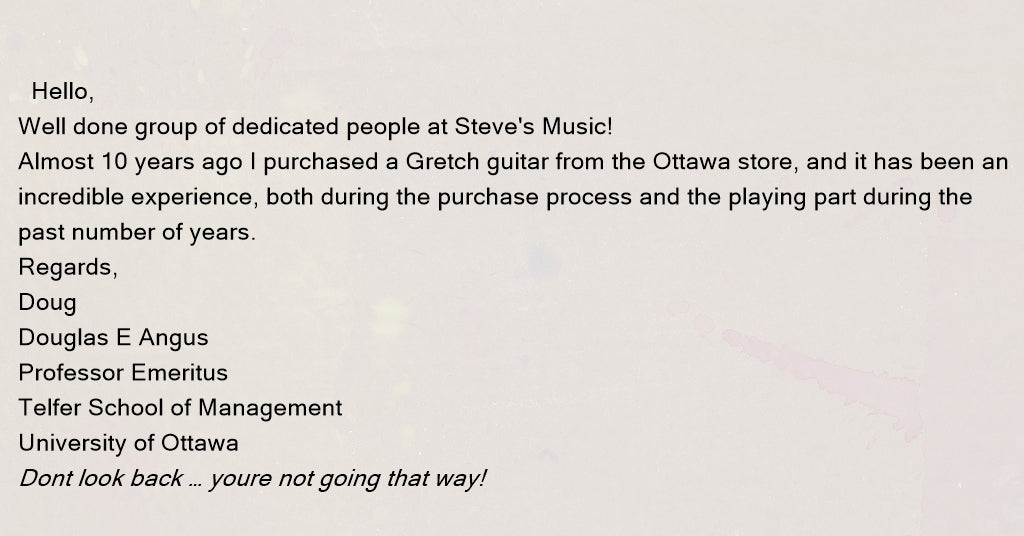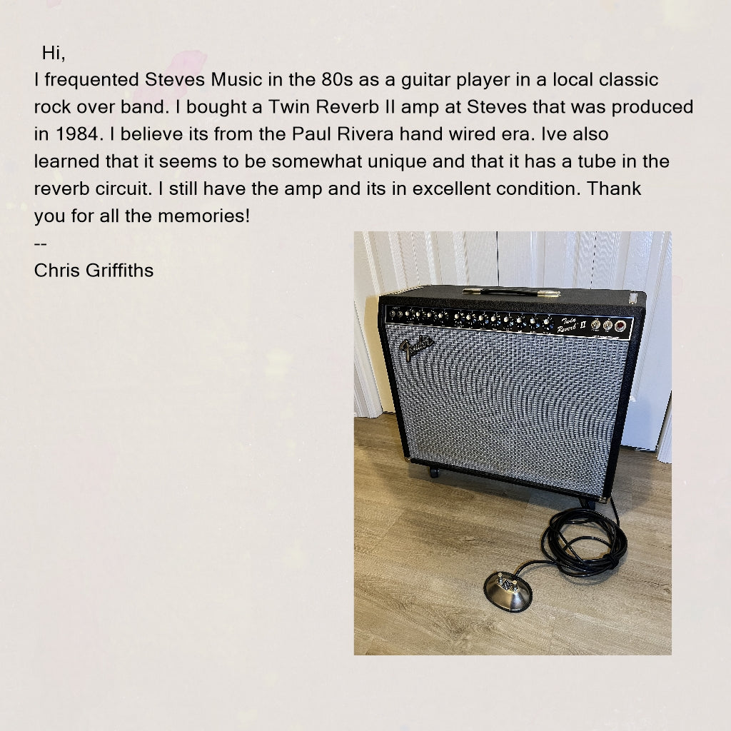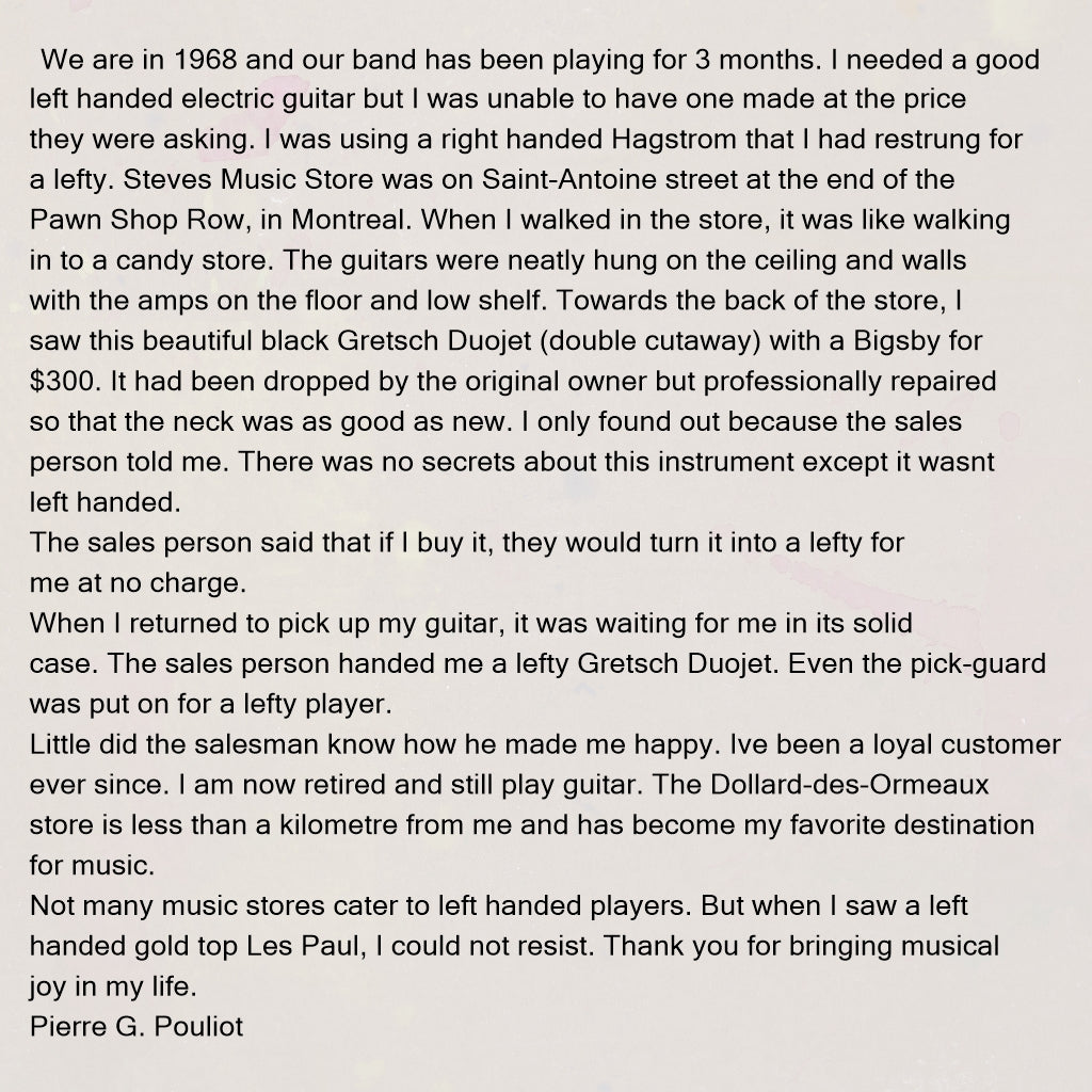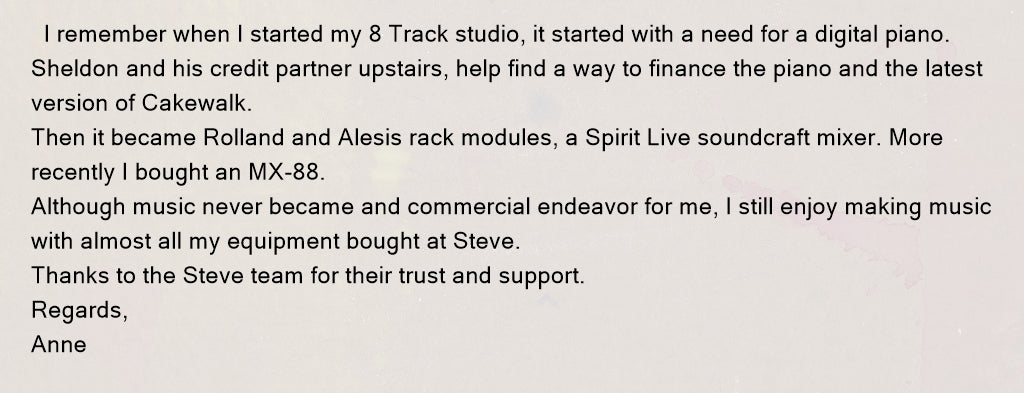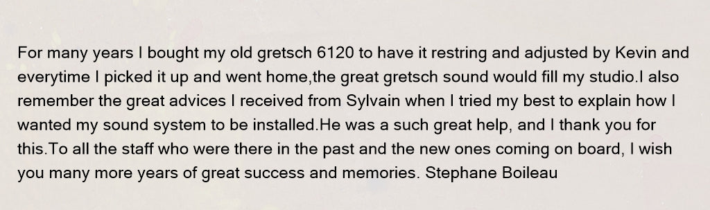 From your modest beginnings to today, I say congratulations for bringing thejoy of music to my life. I’ve been a customer since 1968 and still play musictoday thanks to Steve’s.Pierre G. Pouliot