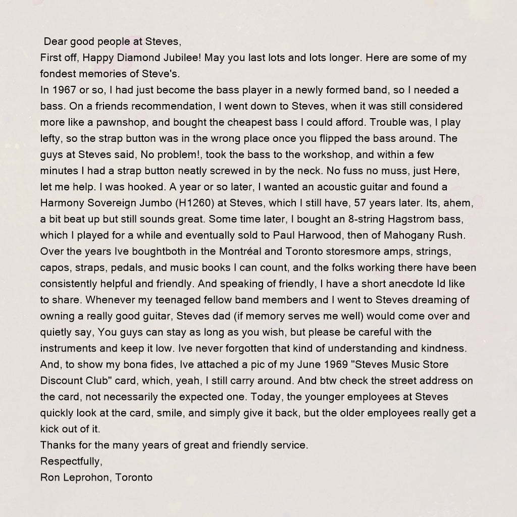 Envoyez toutes vos contributions à : steves60@stevesmusic.com et participez à cette étape importante de l'histoire de Steve's™ Music Store. Faisons de ce 60e anniversaire une fête inoubliable !
