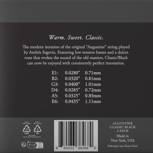SÉRIE CLASSIC TREBLE En 1946, Albert Augustine a développé et lancé la première corde de guitare classique en nylon au monde, remplaçant les cordes en boyau naturel, jusque-là standard. Cette corde a été développée grâce aux conseils et aux retours d'Andrés Segovia, le guitariste classique le plus renommé du XXe siècle. La technologie d'extrusion moderne permet désormais à Augustine Strings de proposer la formule originale des cordes aiguës en nylon, mais avec une intonation parfaite. Les cordes Augustine Classic Treble sont disponibles en bleu, rouge, noir et or. Leur sonorité chaude, ronde et moelleuse est plébiscitée par les artistes en quête du « son Segovia » traditionnel de l'époque. Il a fallu attendre des décennies avant que d'autres matériaux en nylon et en fibre de carbone ne soient introduits pour les cordes de guitare classique. Ainsi, lorsqu'on écoute les enregistrements des premières légendes de la guitare classique – Segovia, Julian Bream, John Williams ou le célèbre duo brésilien des frères Abreu –, on entend les cordes Classic Treble.