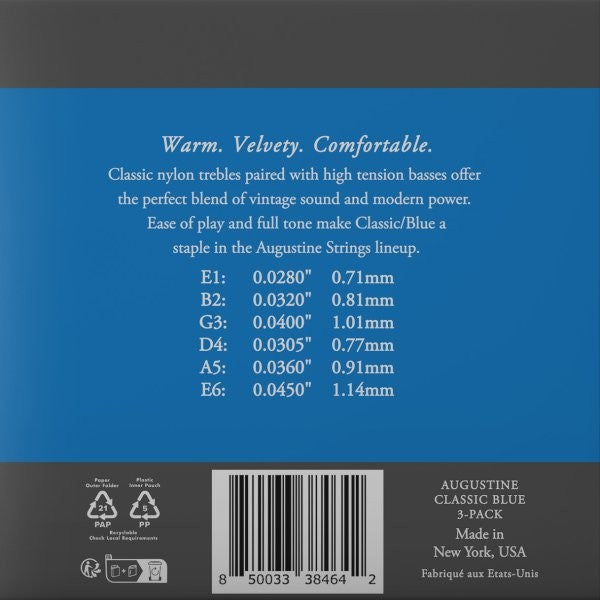 SÉRIE CLASSIC TREBLE En 1946, Albert Augustine a développé et lancé la première corde de guitare classique en nylon au monde, remplaçant les cordes en boyau naturel, jusque-là standard. Cette corde a été développée grâce aux conseils et aux retours d'Andrés Segovia, le guitariste classique le plus renommé du XXe siècle. La technologie d'extrusion moderne permet désormais à Augustine Strings de proposer la formule originale des cordes aiguës en nylon, mais avec une intonation parfaite. Les cordes Augustine Classic Treble sont disponibles en bleu, rouge, noir et or. Leur sonorité chaude, ronde et moelleuse est plébiscitée par les artistes en quête du « son Segovia » traditionnel et du son de cette époque. Il a fallu attendre des décennies avant que d'autres matériaux en nylon et en fibre de carbone ne soient introduits pour les cordes de guitare classique. Ainsi, lorsqu'on écoute les enregistrements des premières légendes de la guitare classique – Segovia, Julian Bream, John Williams ou le célèbre duo brésilien des frères Abreu –, on entend les cordes Classic Treble.