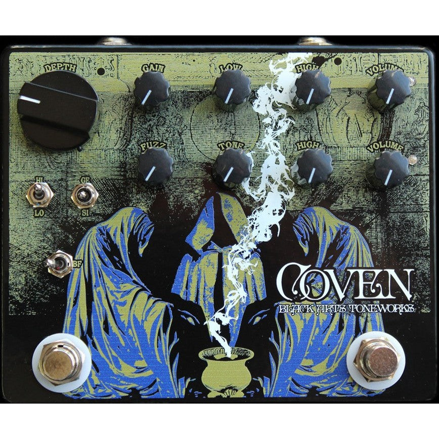 The Black Arts Coven takes two very useful circuits and combines them into one unit, saving space, cabling and powering. The Pharaoh and Black Forest are here in their entirety with the addition of a toggle to switch the order of the effects. Pharaoh into Black Forest or Black Forest into Pharaoh at the flick of a switch. A hugely useful tone-shaping tool, the Coven is the joining of two forces to create a new unified path. This pedal operates on a standard 9 V DC power supply. No battery connection.