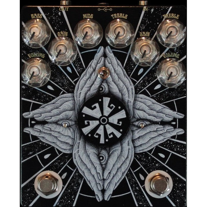 Some time ago, Black Arts worked with Mike Scheidt from YOB to design a distortion pedal which addressed the shortcomings of his favorite distortion at that time, the Ross Distortion. We used his pedal as a starting point and by adding a three-band active EQ between gainstages among other tweaks we achieved the desired tonality, aggression and volume boosting capabilities needed to push amps and address EQ needs of changing rooms on tour. The active EQ can control low / mid / treble but being between gain stages it can boost those frequencies into more or less distortion as needed. Low gain settings were of great importance to us and we were able to dial in clarity and articulation to make it a useful toneshaper in both live and studio applications. Mike road-tested the design and it was released as the Quantum Mystic OD. It was used on the 2014 YOB album "Clearing the Path to Ascend".