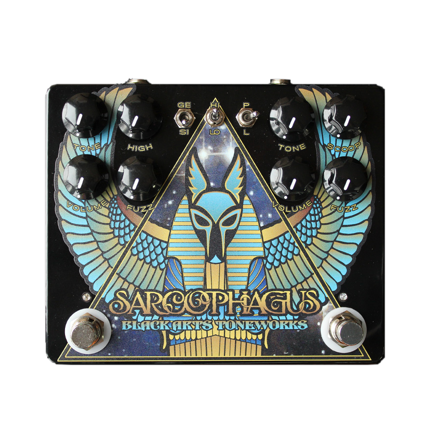 La Sarcophage prend deux circuits massifs et les combine en une unité, en économisant de l'espace, le câblage et de l'alimentation électrique. La Pharaoh et la LSTR sont tous les deux présentes de manière intégrale avec l'ajout d'une commande pour inverser l'effet. Pharaoh dans LSTR ou LSTR dans Pharaoh. Construite spécialement pour les fous de distorsion, ceux qui aiment en avoir toujours plus. Plus de gain, plus de "low end", plus de volume. Une pédale aux proportions hors normes, tout droit sortie de l'enfer. Cette pédale fonctionne sur une alimentation Standard 9VDC. Pas de connexion batterie.