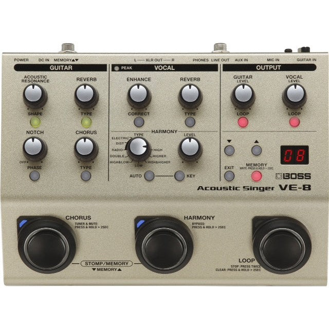 Une solution pour les guitaristes-chanteurs De nos jours, la concurrence est rude pour les chanteurs qui s'accompagnent à la guitare acoustique. Mais le VE-8 Acoustic Singer va vous permettre de sortir du lot grâce à la qualité professionnelle BOSS, quel que soit l'endroit où vous vous produirez. Facile d'utilisation, le VE-8 traite votre voix et votre son de guitare avec un résultat de qualité professionnelle, produit d'impressionnantes harmonies en temps réel ainsi que des loops, le tout dans un boîtier compact et prêt pour toutes les conditions de jeu. Avec un son de cette qualité et de puissantes options de créativité à votre disposition, à chaque concert, vous devriez casser la baraque.