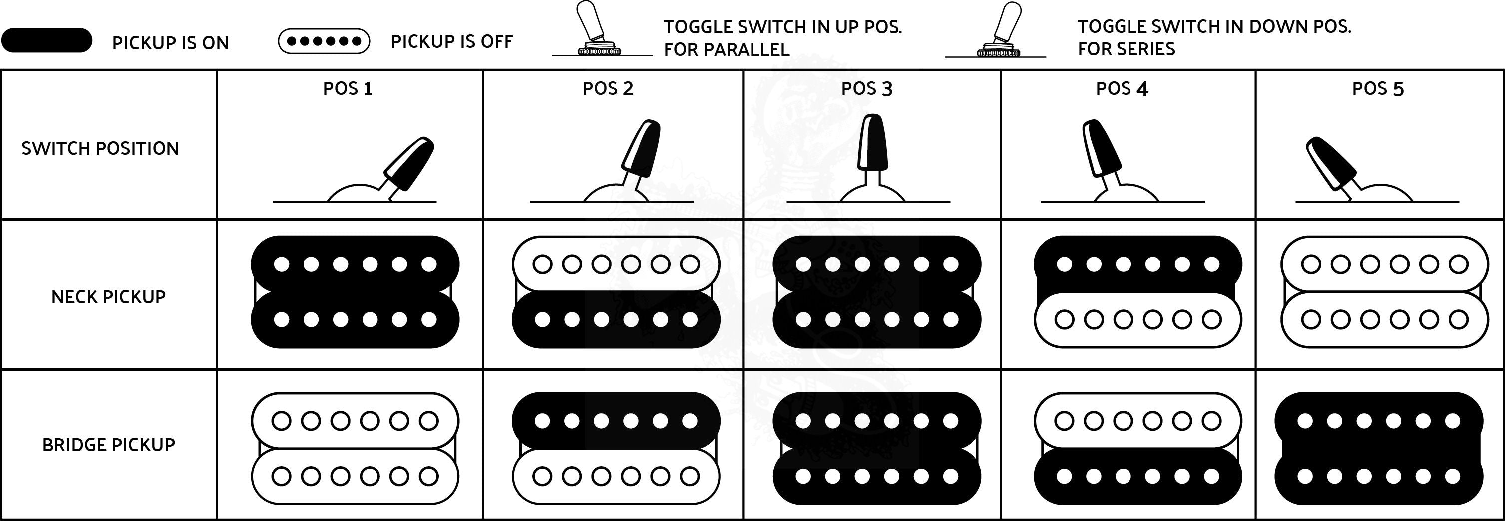 Commutation du micro: lame à 5 positions et mini-touche à 2 voies: (Pos 1: micro à pont, Pos 2: les deux bobines extérieures, Pos 3: micro à pont et à manche, Pos 4: les deux bobines intérieures, Pos 5: micro à manche; mini-touche à 2 voies en bas/toutes les séries ; mini-touche à 2 voies en haut/toutes les séries parallèles