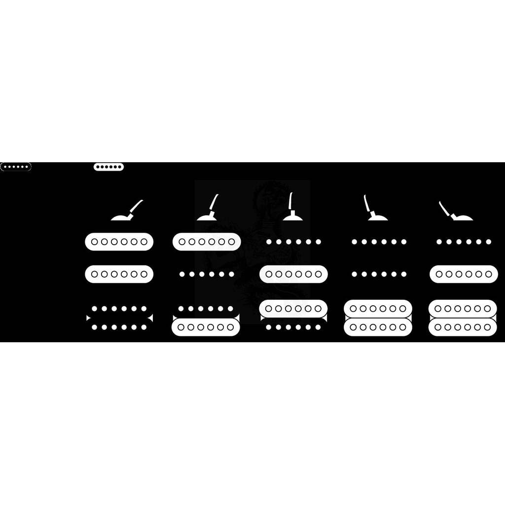 Lame de commutation à 5 positions: Position 1. Micro à pont complet, position 2. Bobine intérieure du pont et capteur central, position 3. Capteur extérieur du pont et capteur du manche, position 4. Capteur du milieu et du manche, position 5. Capteur de manche complet