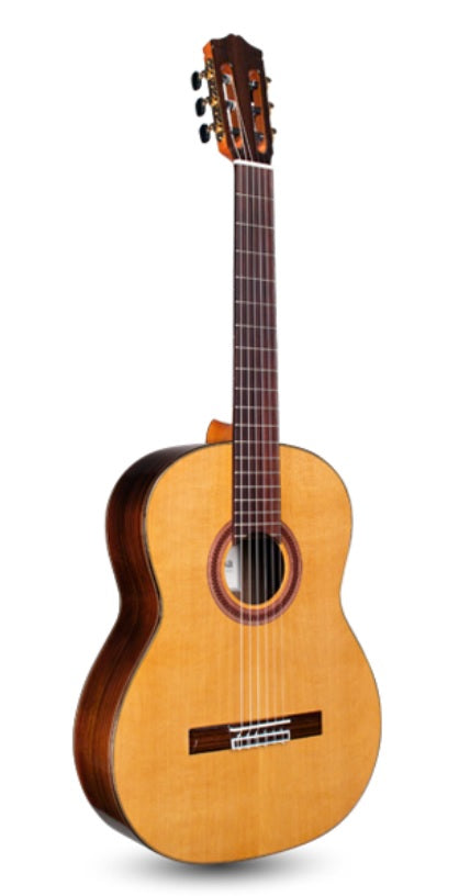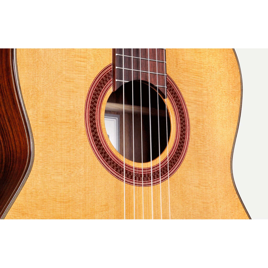 The C7 is a wonderful choice for beginner or intermediate guitarists. A step up from our C5, the C7 offers rosewood back and sides with the choice of a solid cedar top to achieve a warm classic nylon string sound, or a solid European spruce top for a brighter tone. The C7's traditional fan bracing allows for maximum resonance and sustain and premium features such as a hand-inlaid wooden rosette, two-way adjustable truss rod, and a sleek high gloss PU finish.