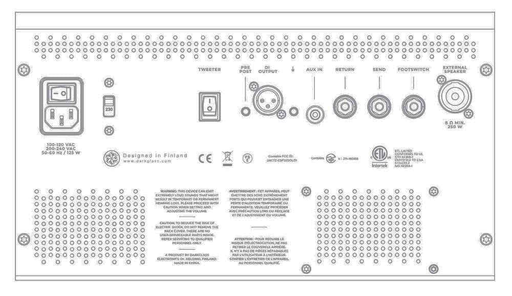 - AC Socket: Use this connector to feed electric power to the amplifier. 100–230 VAC, 50-60 Hz. Set the voltage selector switch to the correct position before turning on the amplifier!