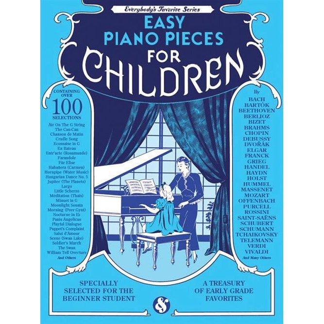 Les compositions de Easy Piano Pieces for Children ont toutes été soigneusement sélectionnées pour le pianiste débutant. Plus de 100 sélections de ce recueil de chansons sont progressivement notées, avec des marquages éditoriaux et des doigtés suggérés, permettant aux enfants débutants d'apprendre avec des chansons spécialement sélectionnées qu'ils apprécieront jouer. Ce grand recueil de chansons comprend des classiques favoris de Mozart, Debussy et Grieg, des miniatures pour piano de Schumann, Arensky et Türk, ainsi que des sélections de Pour les enfants de Bartók, entre autres. Chaque morceau est noté avec une étoile pour indiquer la difficulté, tandis qu'un glossaire des symboles musicaux et un tableau du clavier sont inclus pour aider les jeunes élèves à reconnaître les notes et les touches.