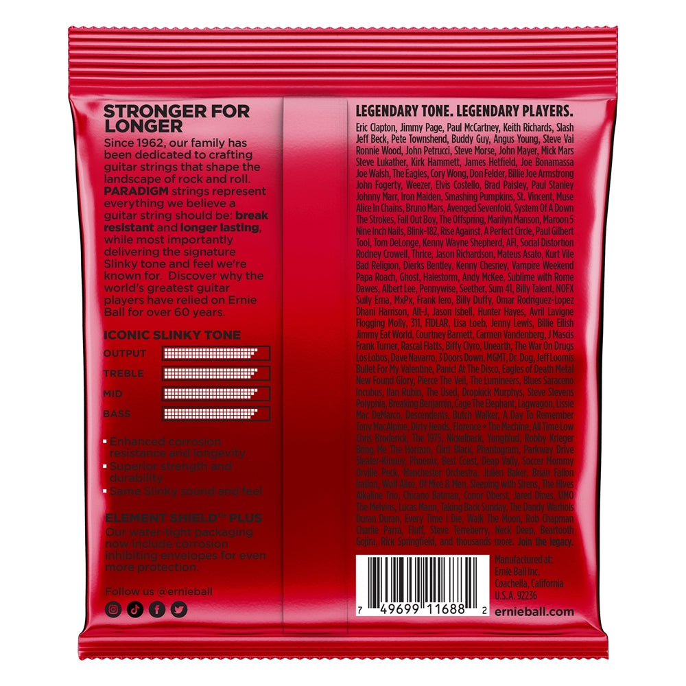 Ernie Ball Slinky Paradigm Electric Guitar Strings provide unprecedented strength and longer life while retaining 100% Slinky tone and feel. Ernie Ball's industry-leading ultra-high strength steel is included in both the wound and plain strings along with a patented reinforcement at the ball-end twist of each plain string to provide superior tensile and fatigue strength for strings that lock into tune fast and hold up under the most stressful playing styles and conditions. The coupling of Ernie Ball's Everlast nanotreatment with breakthrough plasma-enhanced wrap wire provides added corrosion resistance and reduced accumulation of tone-robbing buildup and debris. Experience the first set of longer-lasting strings that are worth playing with all benefits and no compromises. Gauges 0.011, 0.014, 0.018p, 0.030, 0.042, 0.052.