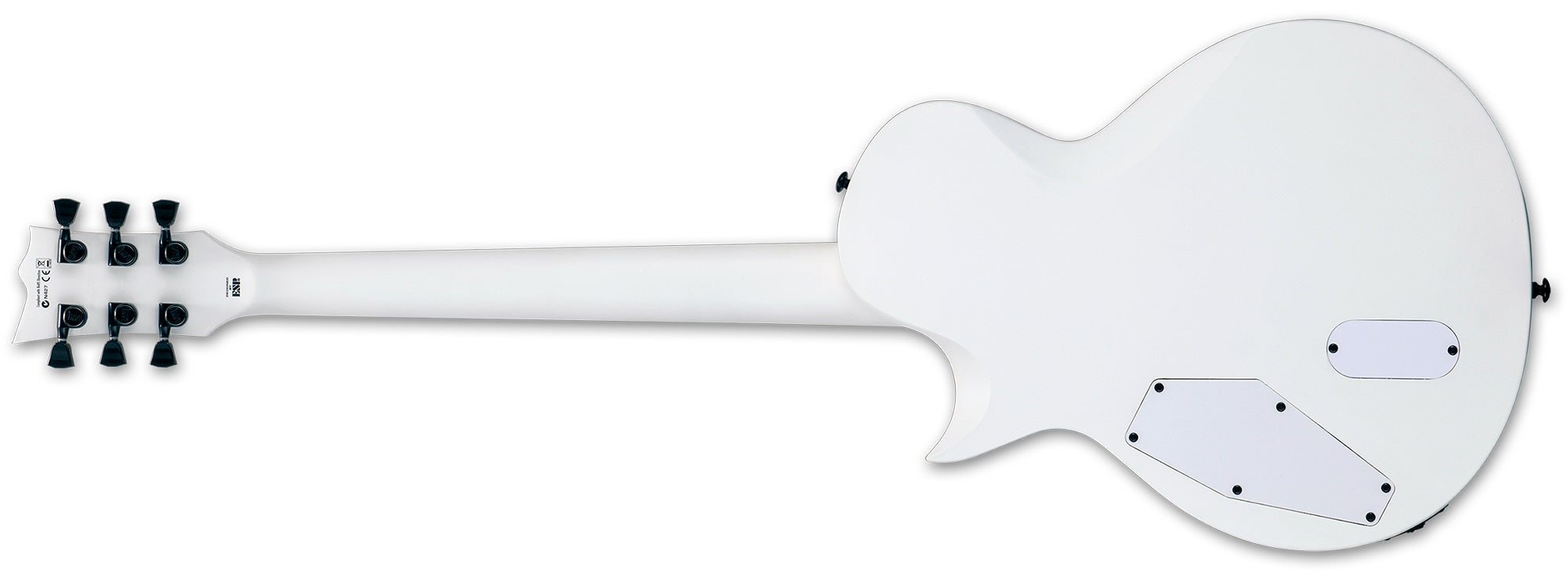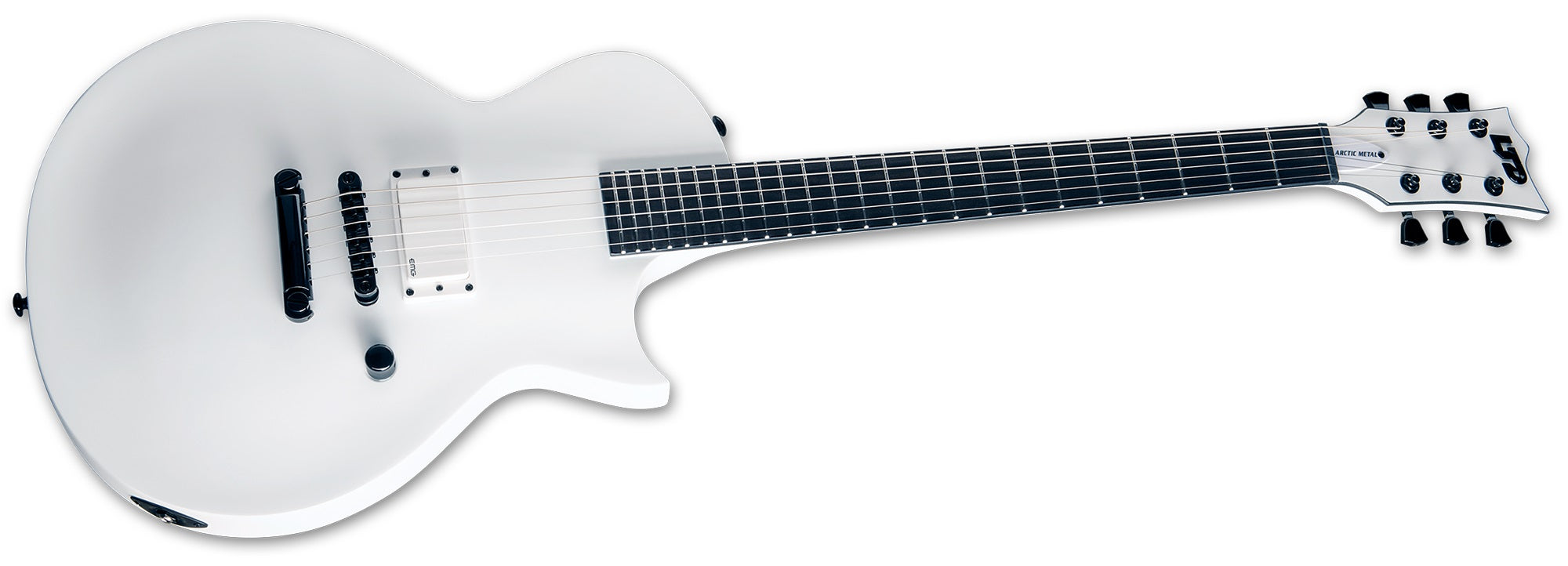 The LTD Arctic Metal Series takes the same design theme of our Black Metal Series and flips the color scheme from the darkest of blacks to the coldest of frozen wastelands. Comparable in build quality to our LTD Deluxe “1000 Series”, Arctic Metal instruments feature a Snow White Satin finish, a single premium-quality pickup with matching white cover, and Macassar ebony fingerboards with no inlays and glow-in-the-dark side markers. The EC Arctic Metal is based on the popular single-cutaway ESP Eclipse shape. It offers set-thru construction for smooth access to the highest frets at 24.75” scale, an aggressive EMG 81TW pickup with black logo, a single volume knob with push-pull control to split the pickup, and 24 extra-jumbo stainless steel frets.